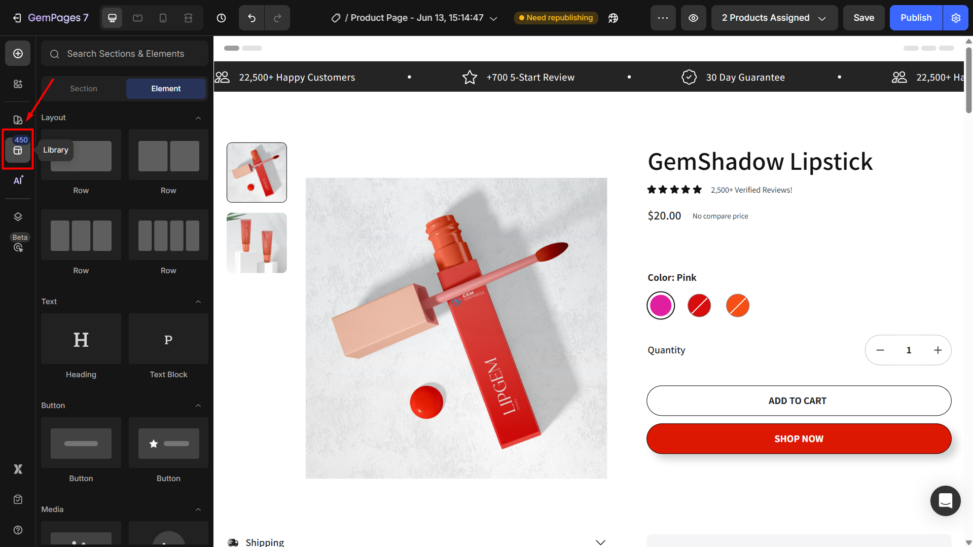 Step 1: From the GemPages Dashboard, open your preferred template to edit. Navigate to the Library at the top of your Editor.