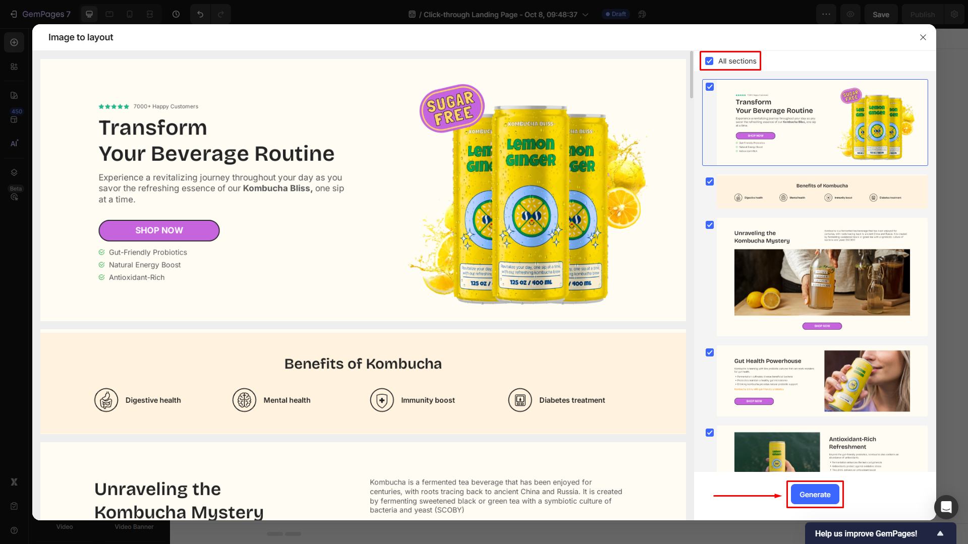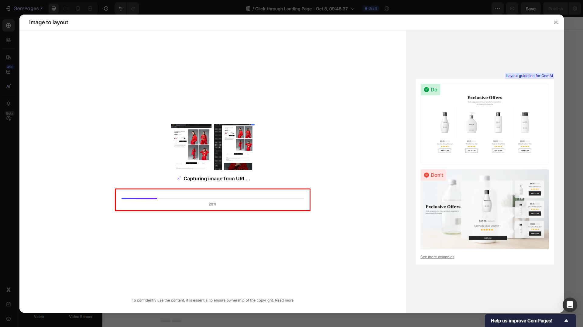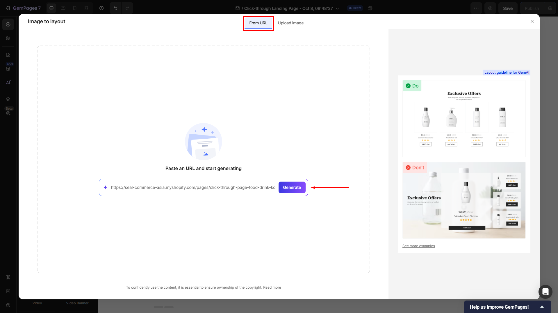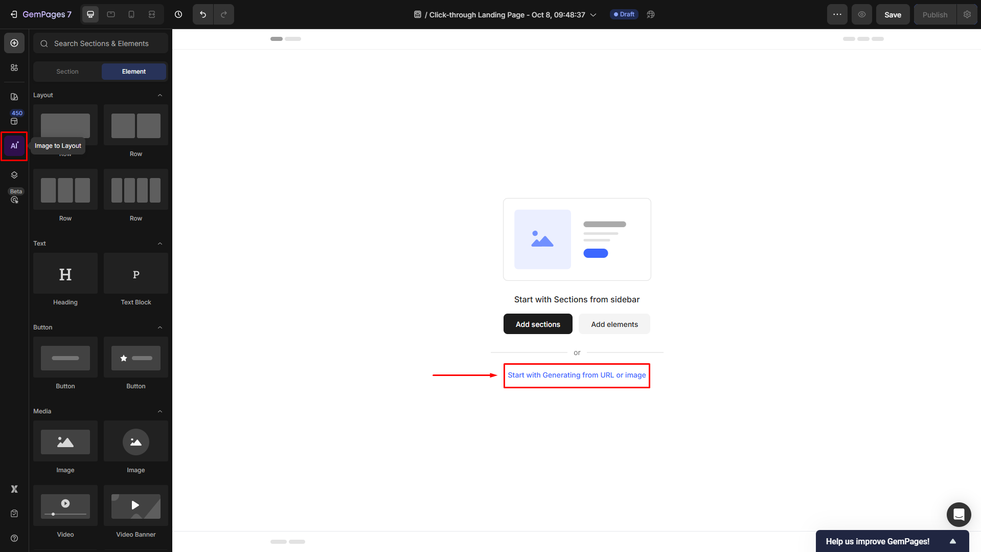 GemPages’ Image-to-Layout feature allows you to replicate the design of any layout you admire, just by an image or URL. Here’s how: