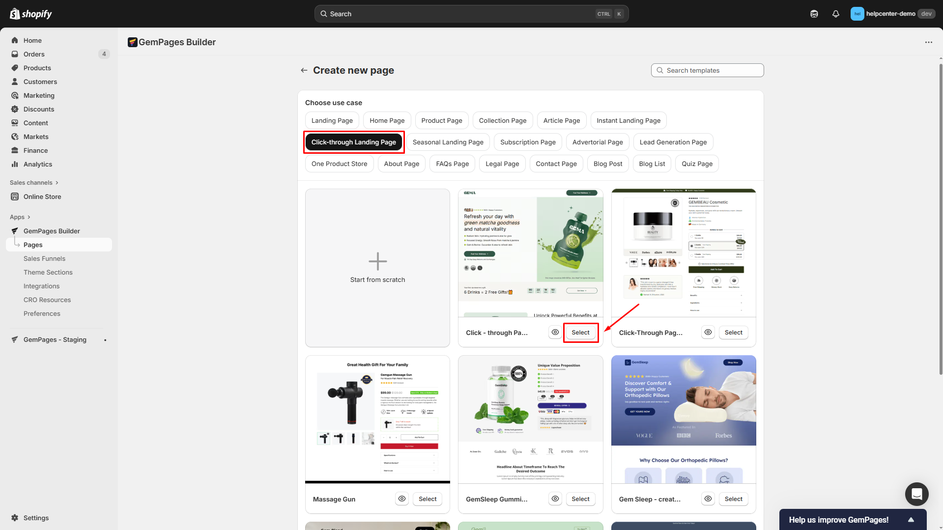 GemPages provides a variety of templates designed for conversion-focused goals, including options suitable for CTPs. When creating a new page, select the “Landing Page” type to explore these templates, or start from scratch to build your own layout.