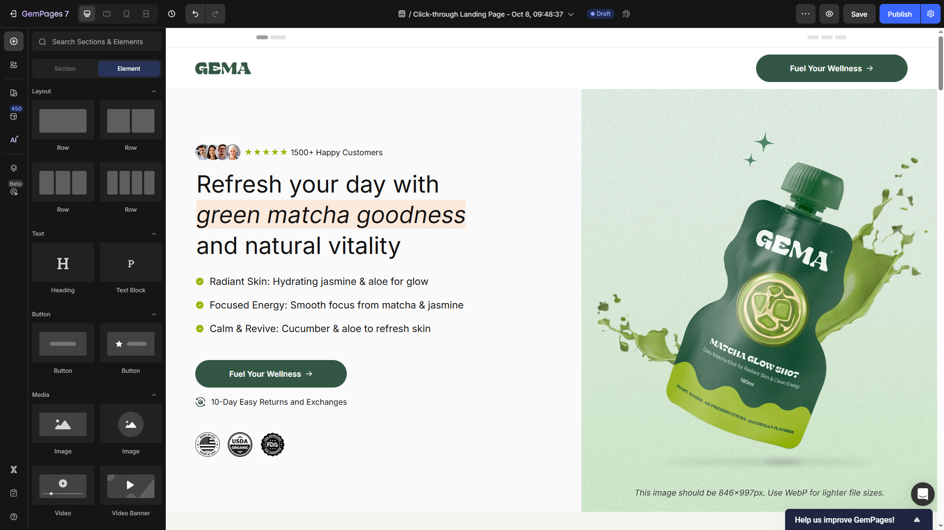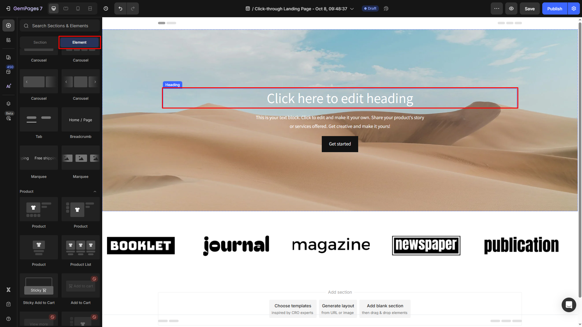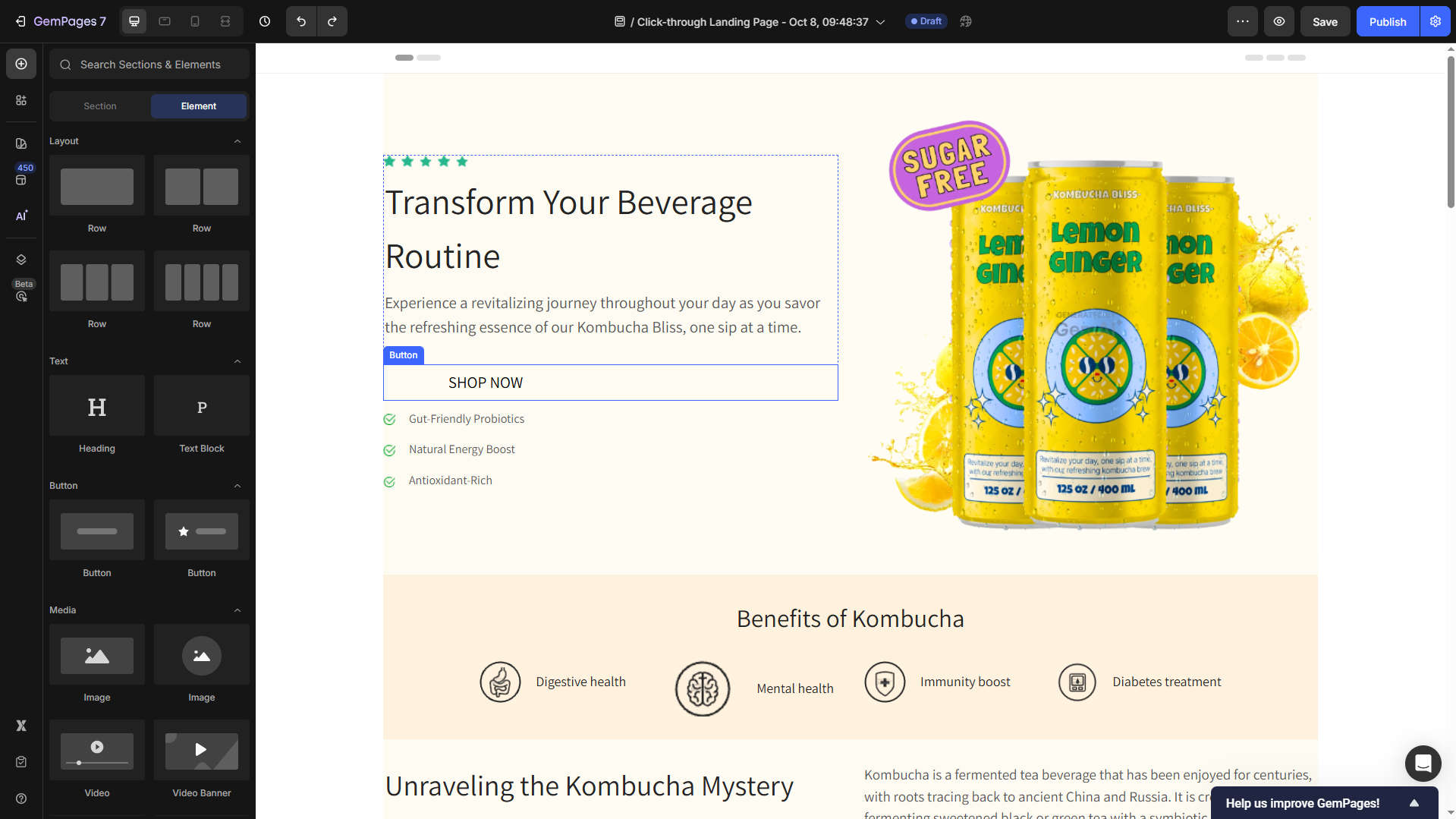 Utilize GemPages elements such as headline, product images or videos, benefit lists, testimonials, and CTA buttons to design your own click-through landing page