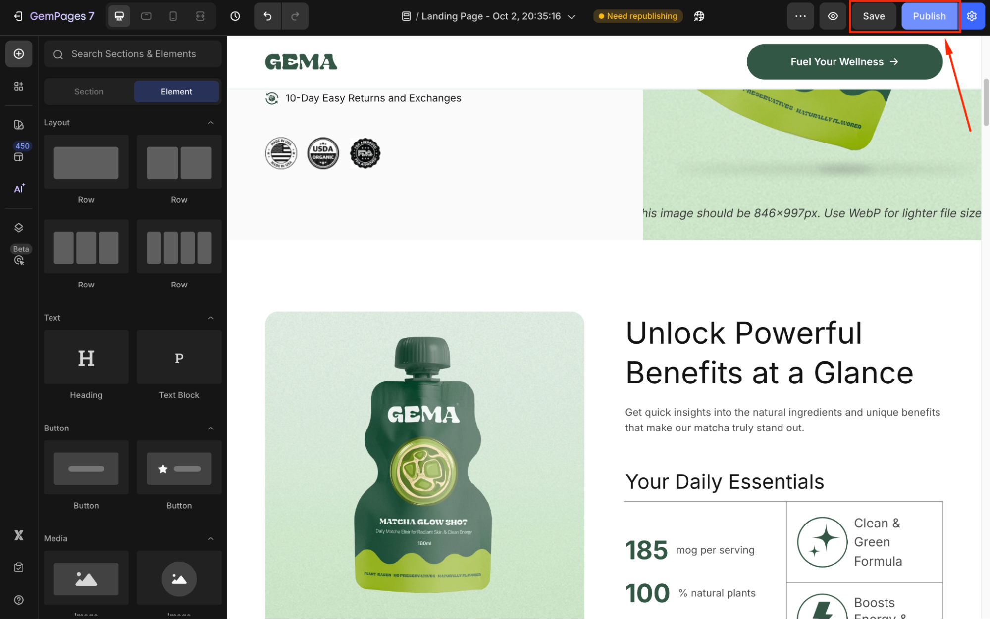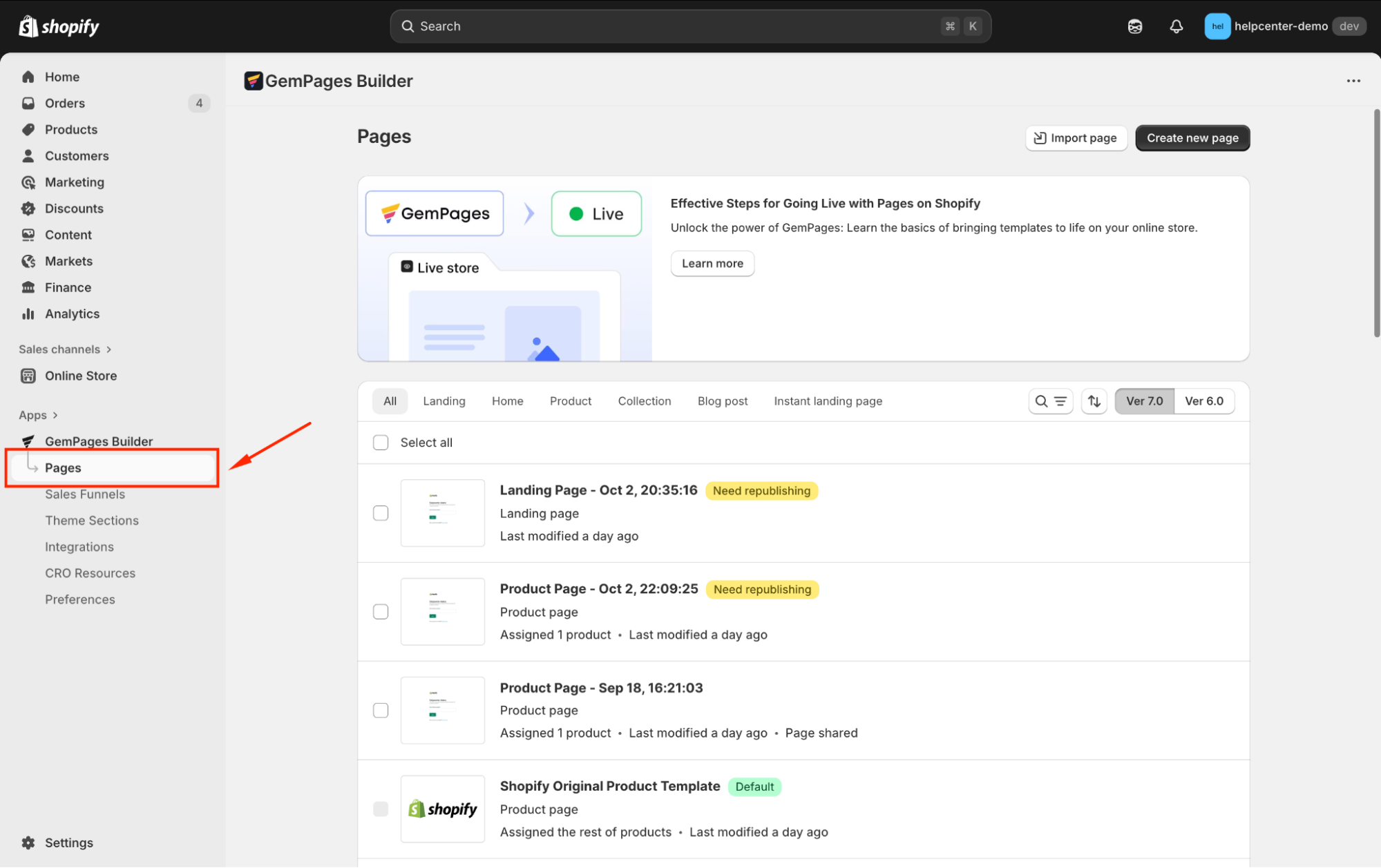- Navigate to the Pages section, where you’ll find all your pages built with GemPages.