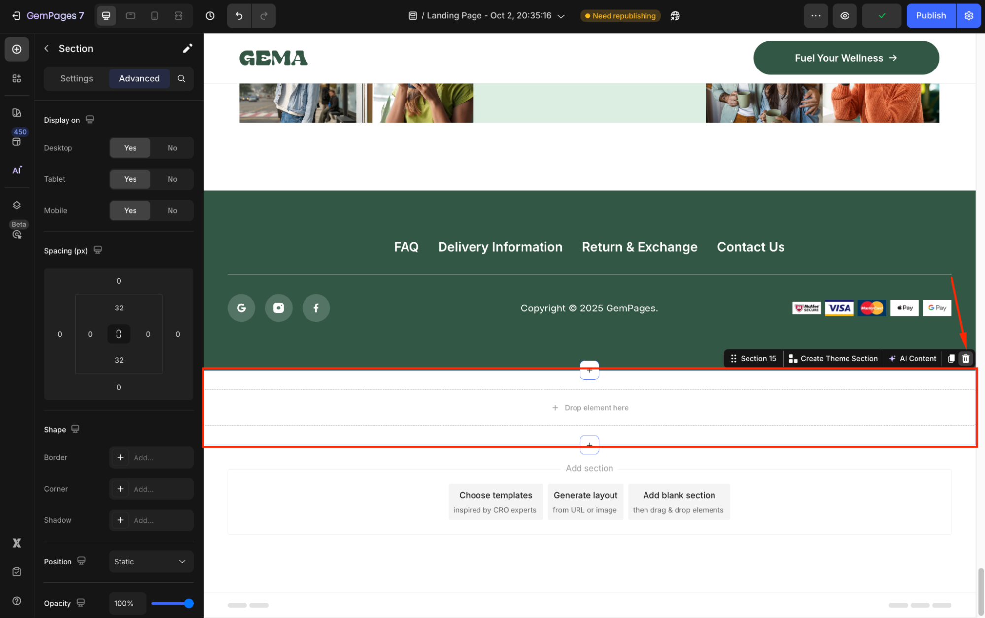 Ensure that you only delete the section from the specific page if you don’t want it removed elsewhere. If the section you’re trying to delete is a theme section, which is a reusable component across multiple pages, deleting it requires extra caution: