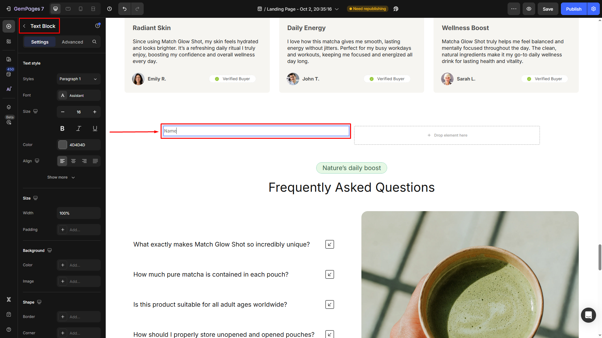 - Double-click on this Text Block Element to edit the text. For example, we change it to “Name“.
