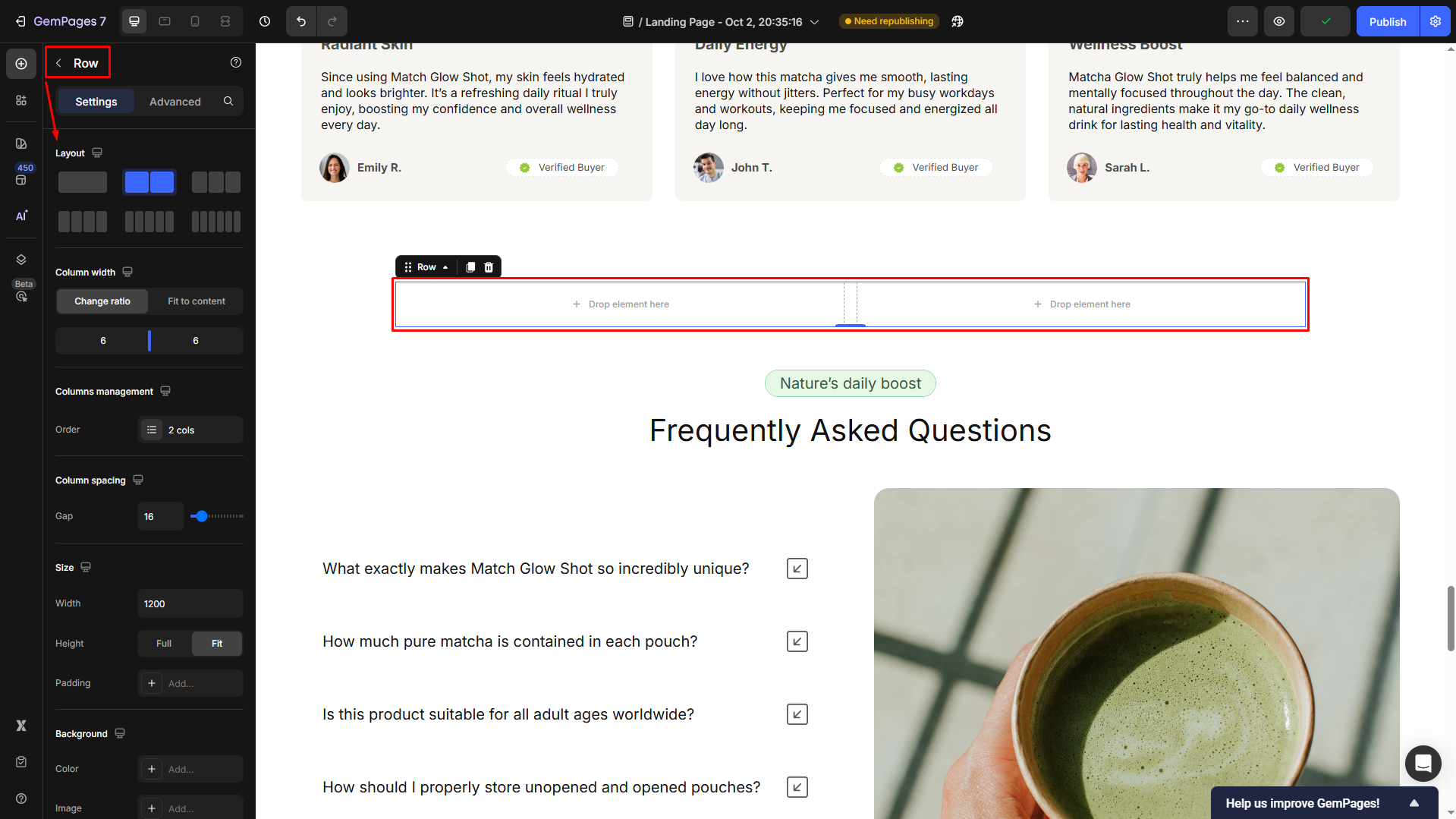 - Under the Layout section in the settings panel, you can configure the row to be either a 1-column or 2-column layout, depending on your preferences.