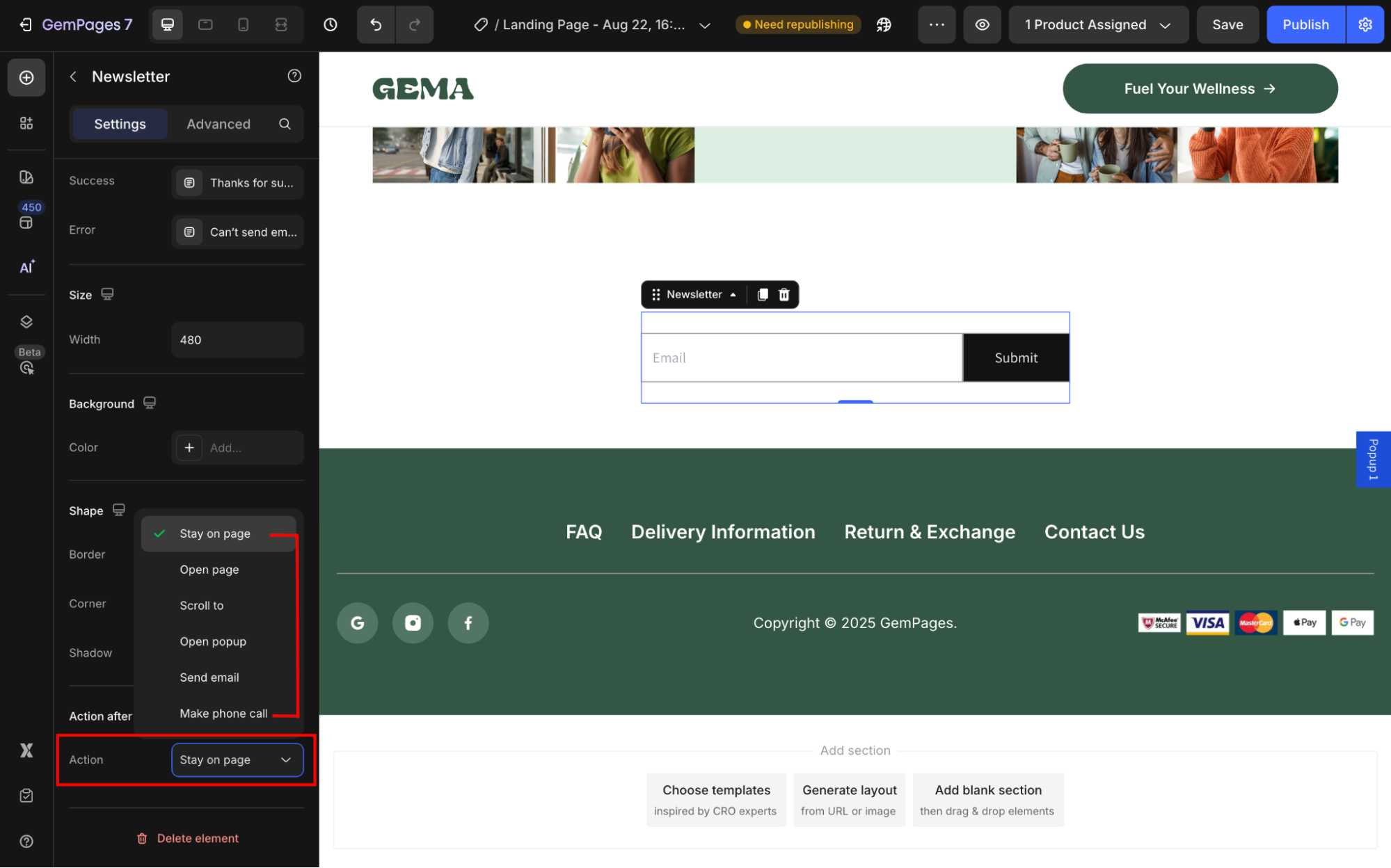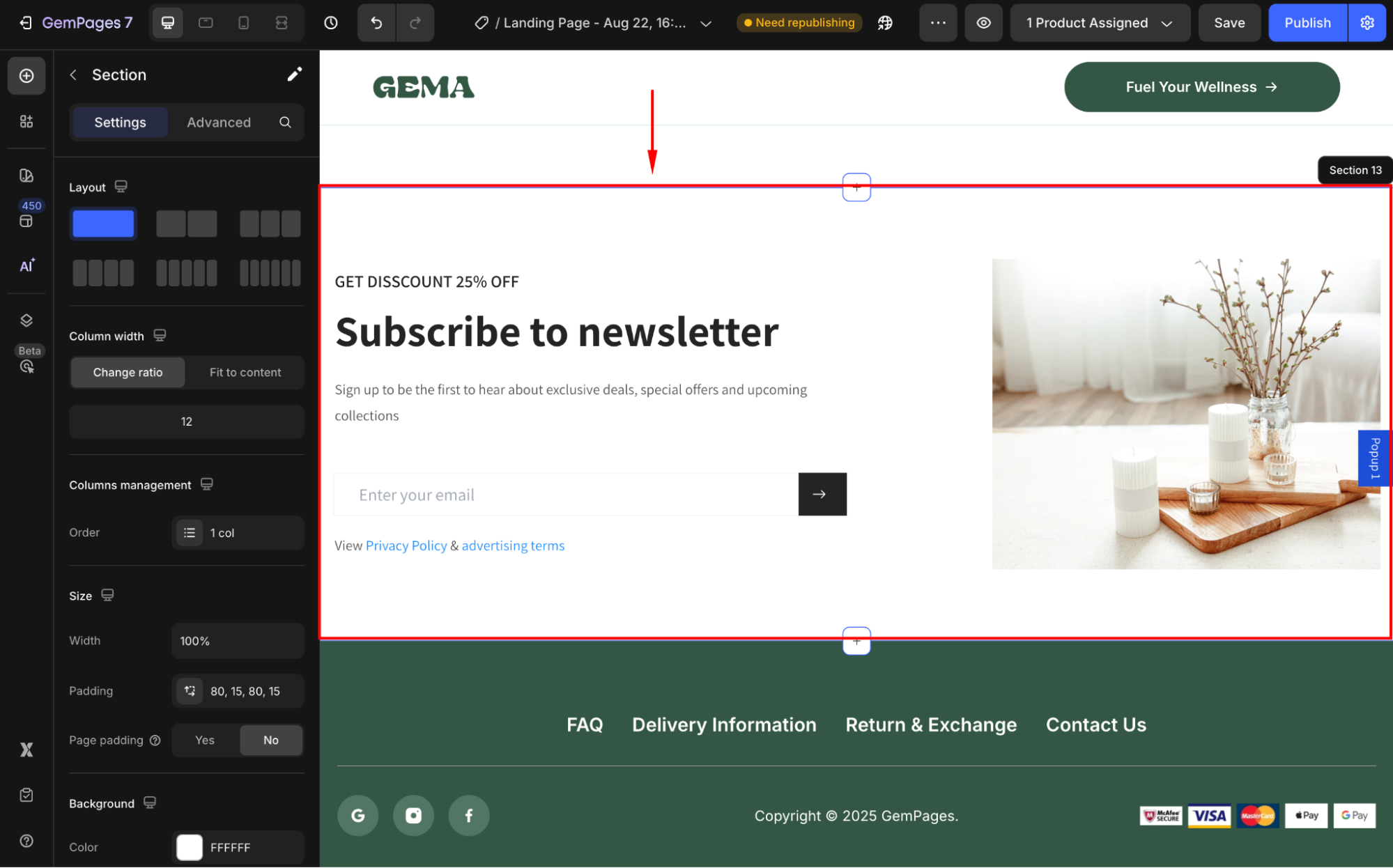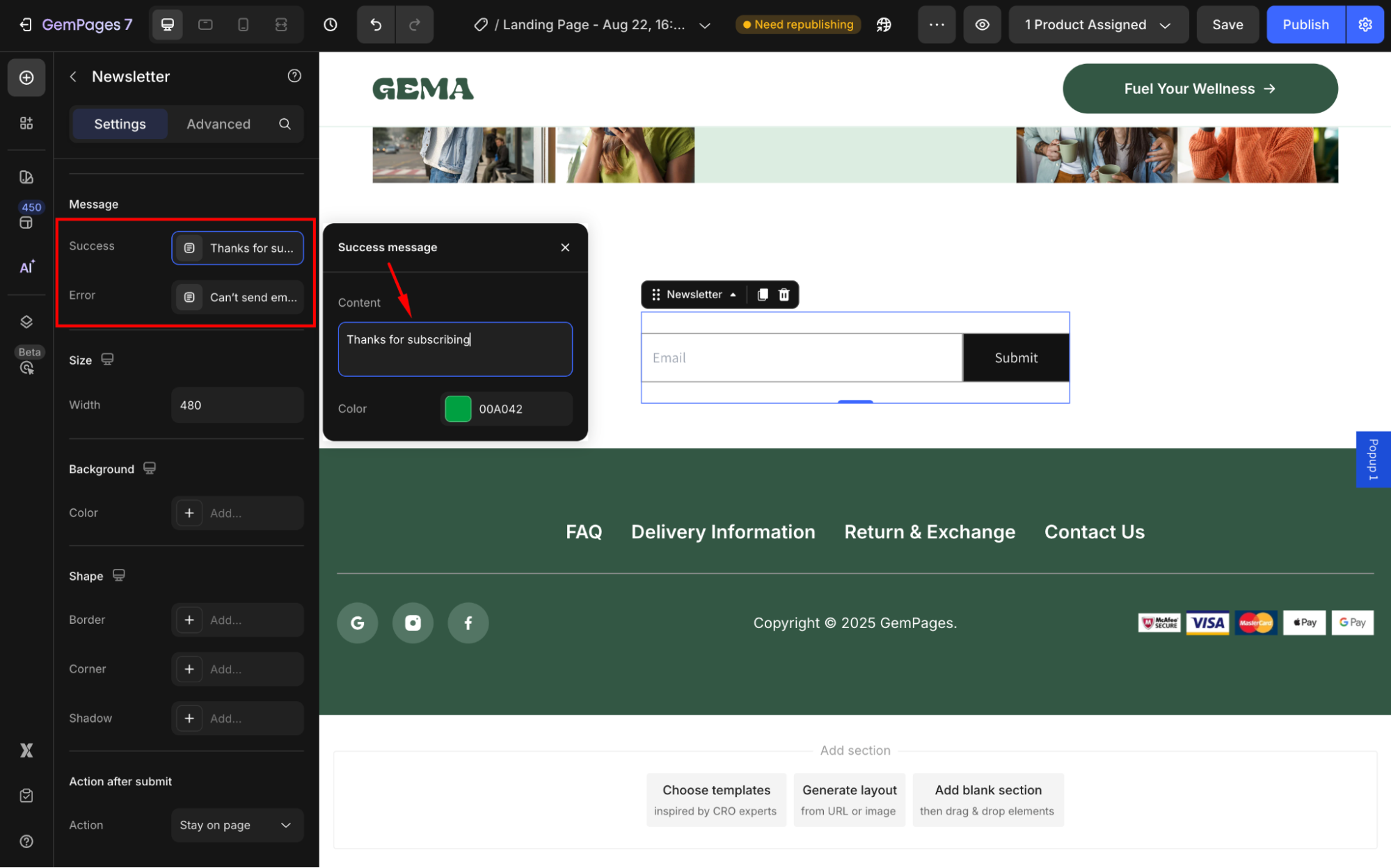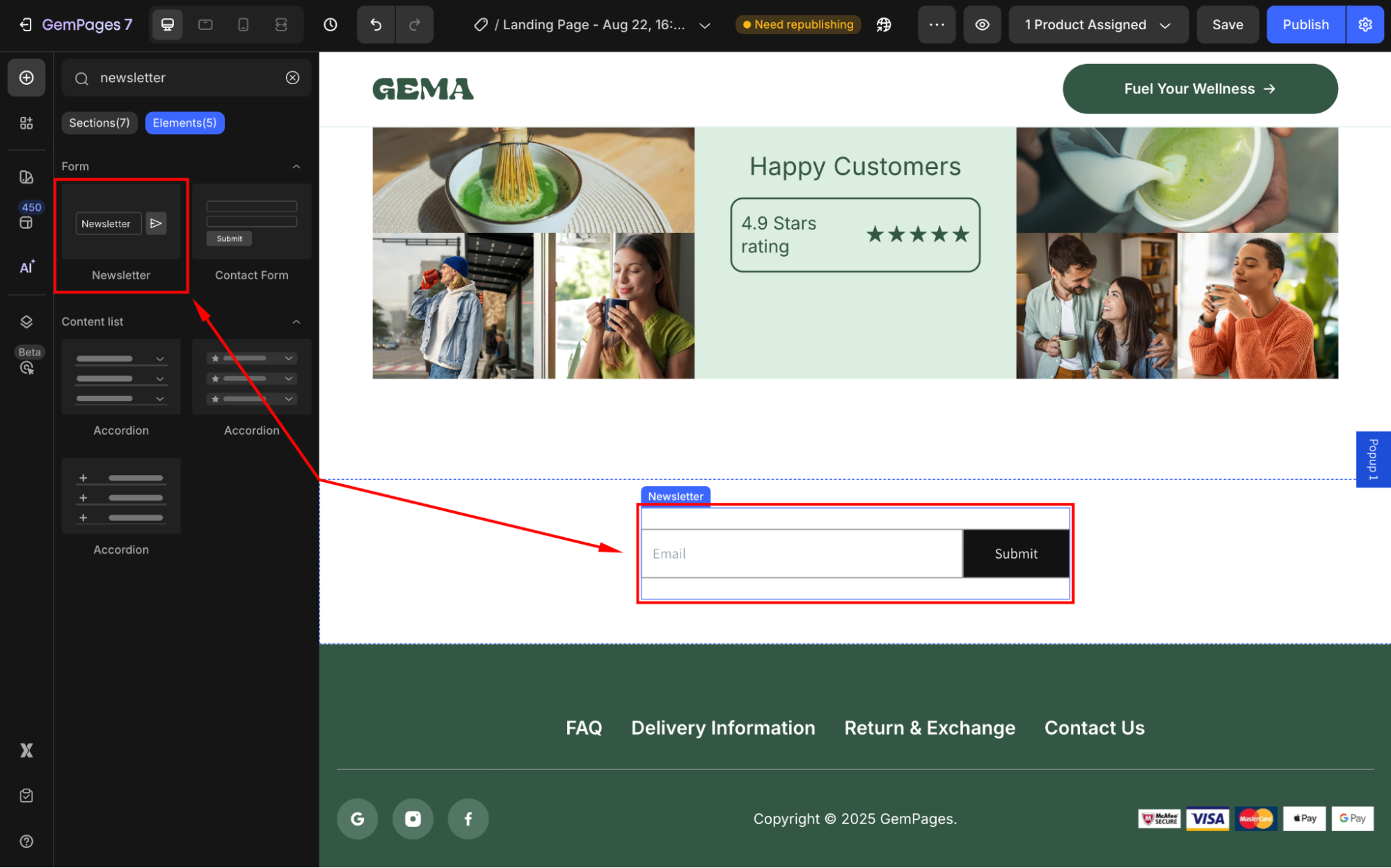 Within GemPages Editor v7, it’s easier than ever to create a newsletter signup form tailored for your store’s design and branding.