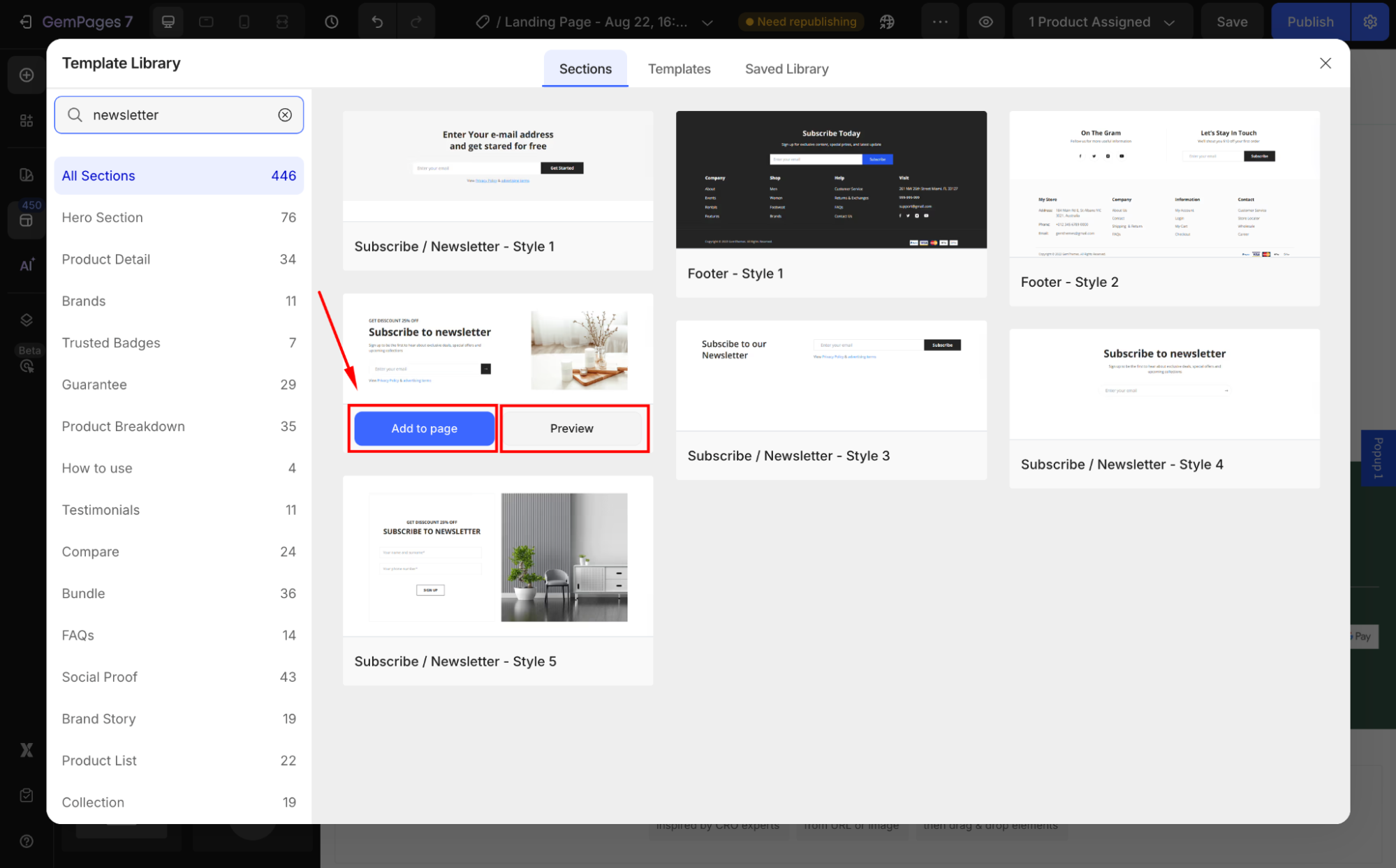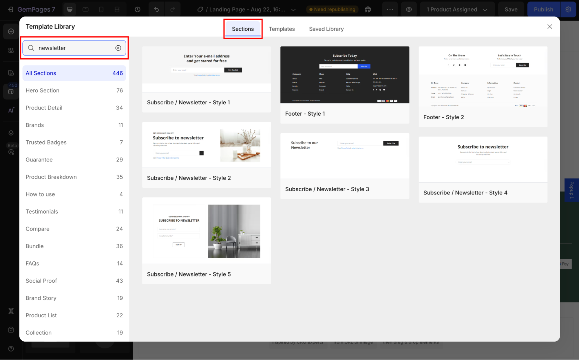 - Navigate to the Section and enter “newsletter” in the search bar.