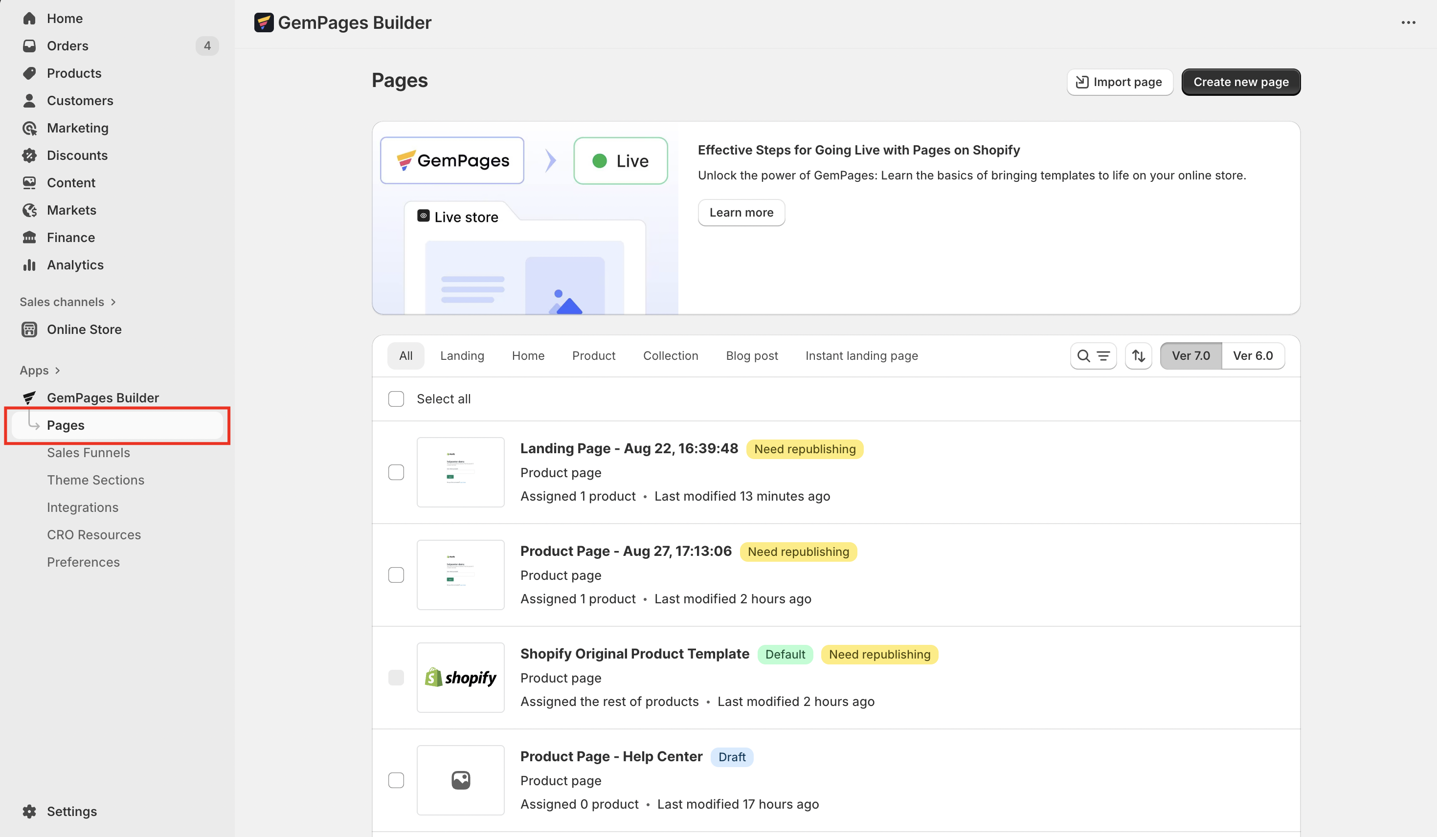 - From your Shopify admin, navigate to Apps > GemPages Builder App.