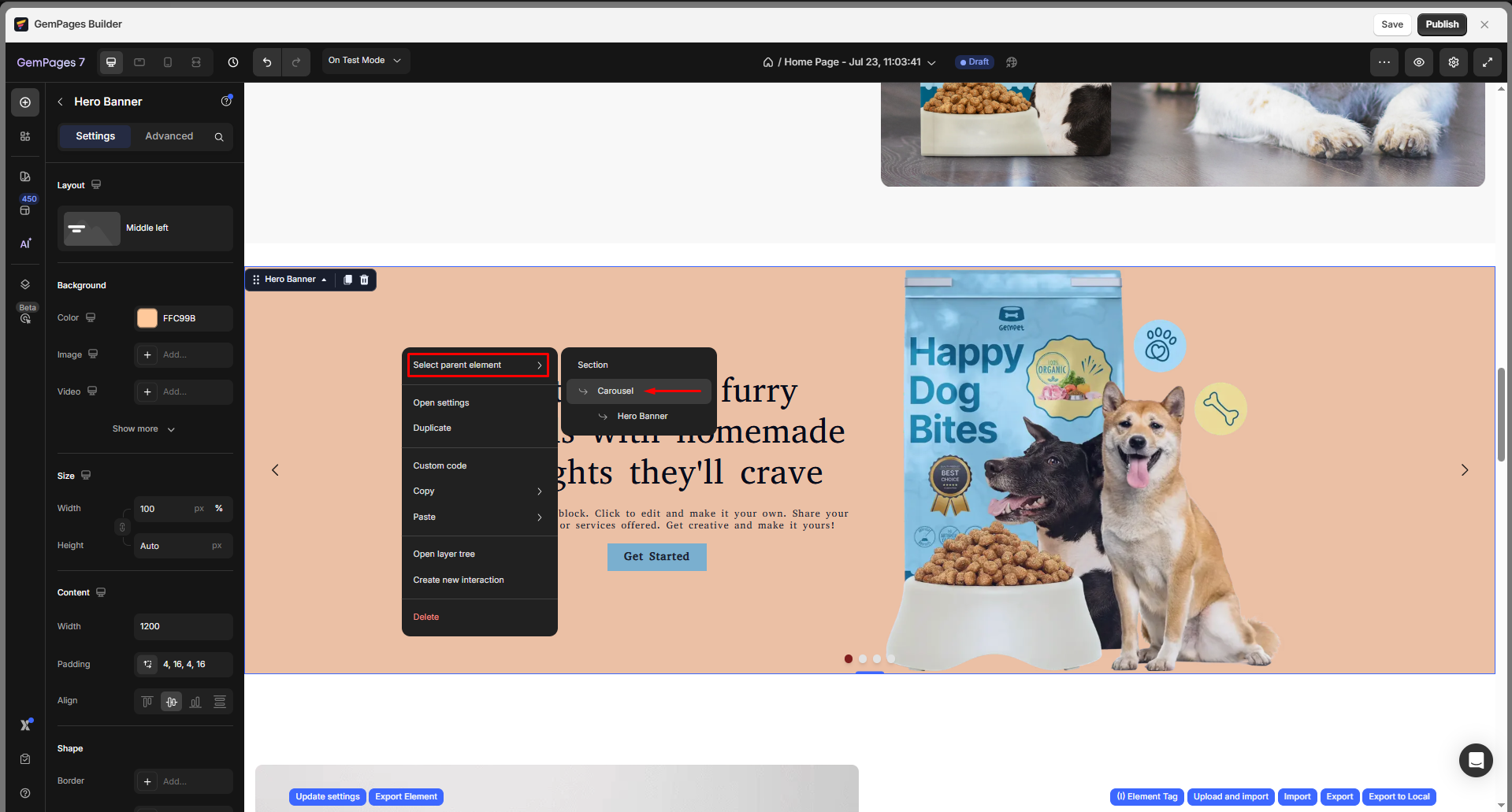 - Right-click on the Hero Banner > select “Select Parent element” to go back to the main Carousel settings.