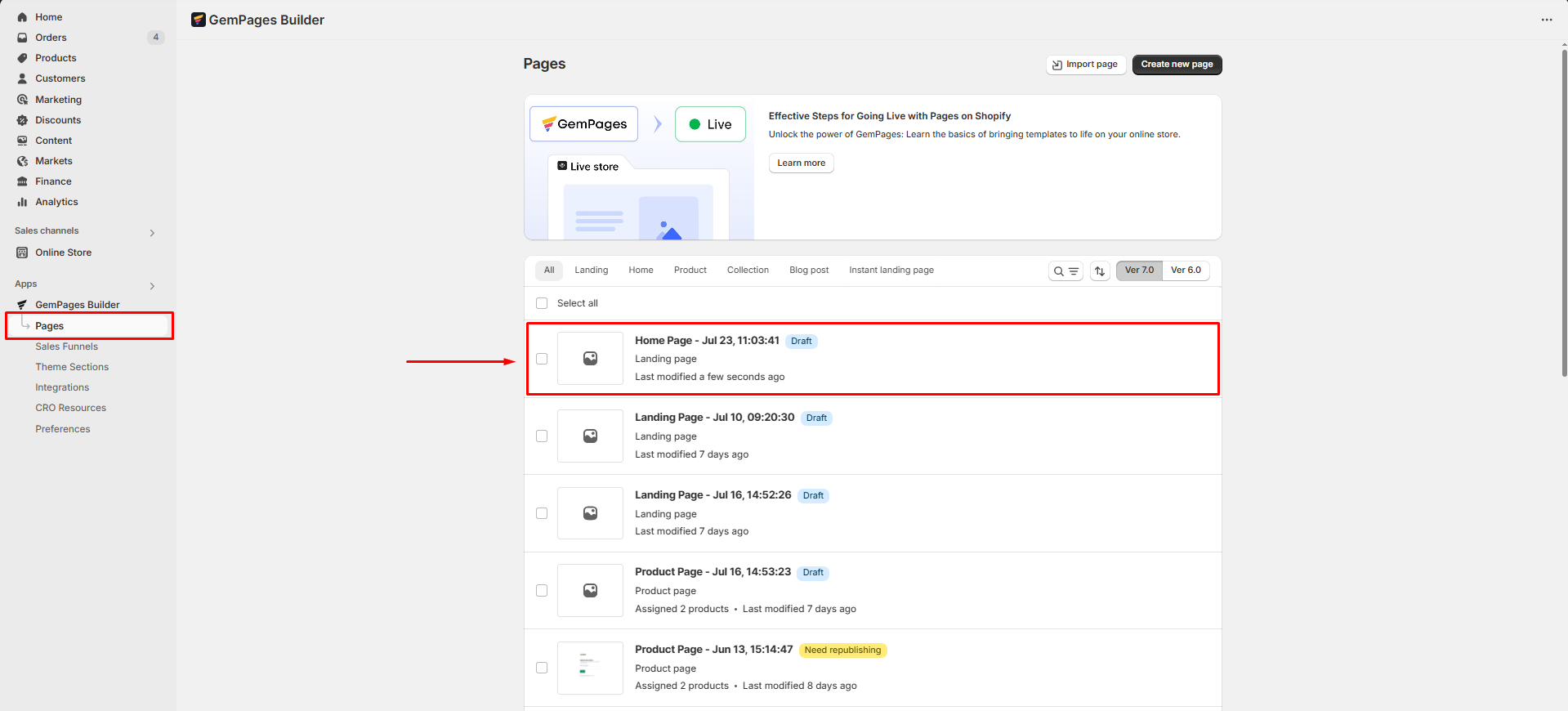 Go to the GemPages Dashboard > Pages, and locate the target page to open the editor.