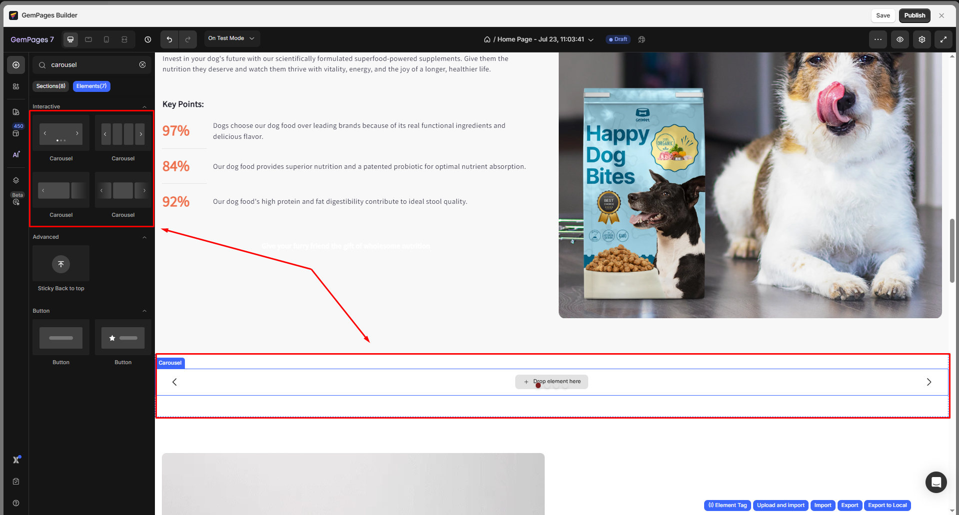 Drag and drop the Carousel Element into the section where you want the slideshow to appear.