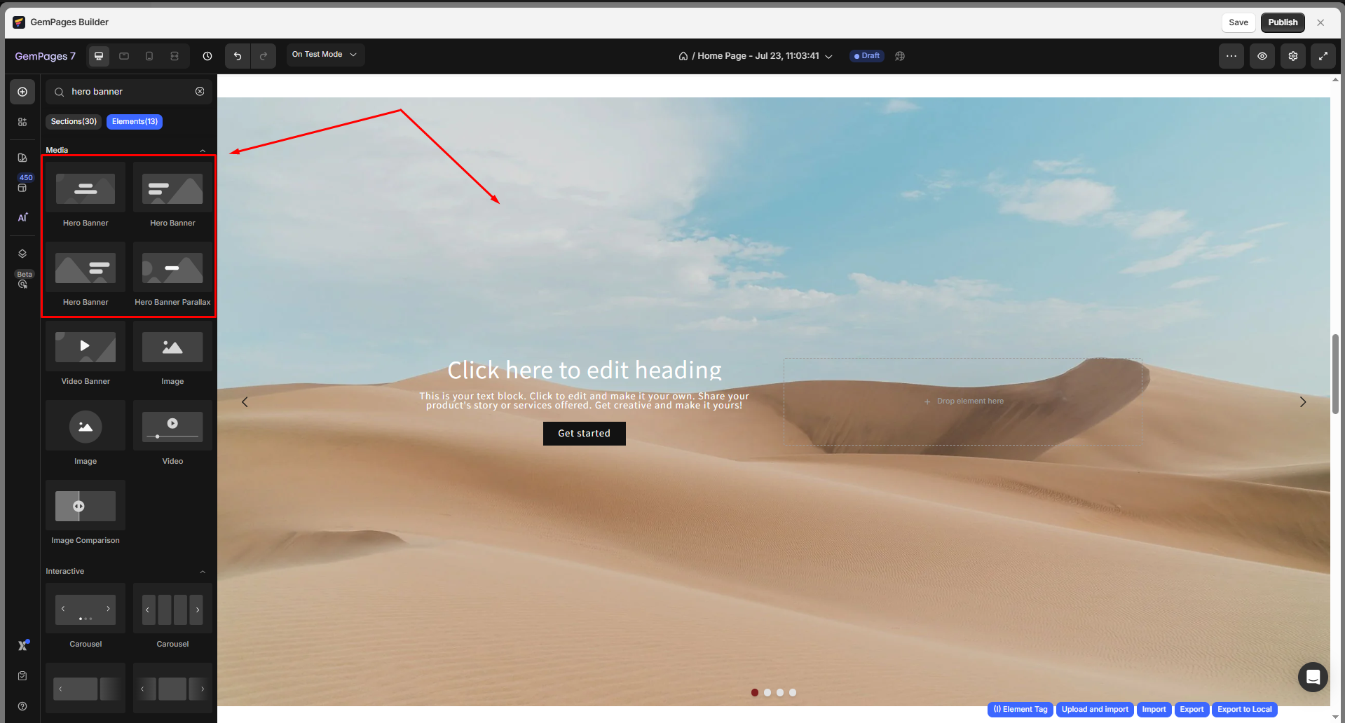 From the left sidebar, drag and drop a Hero Banner Element into the Carousel.