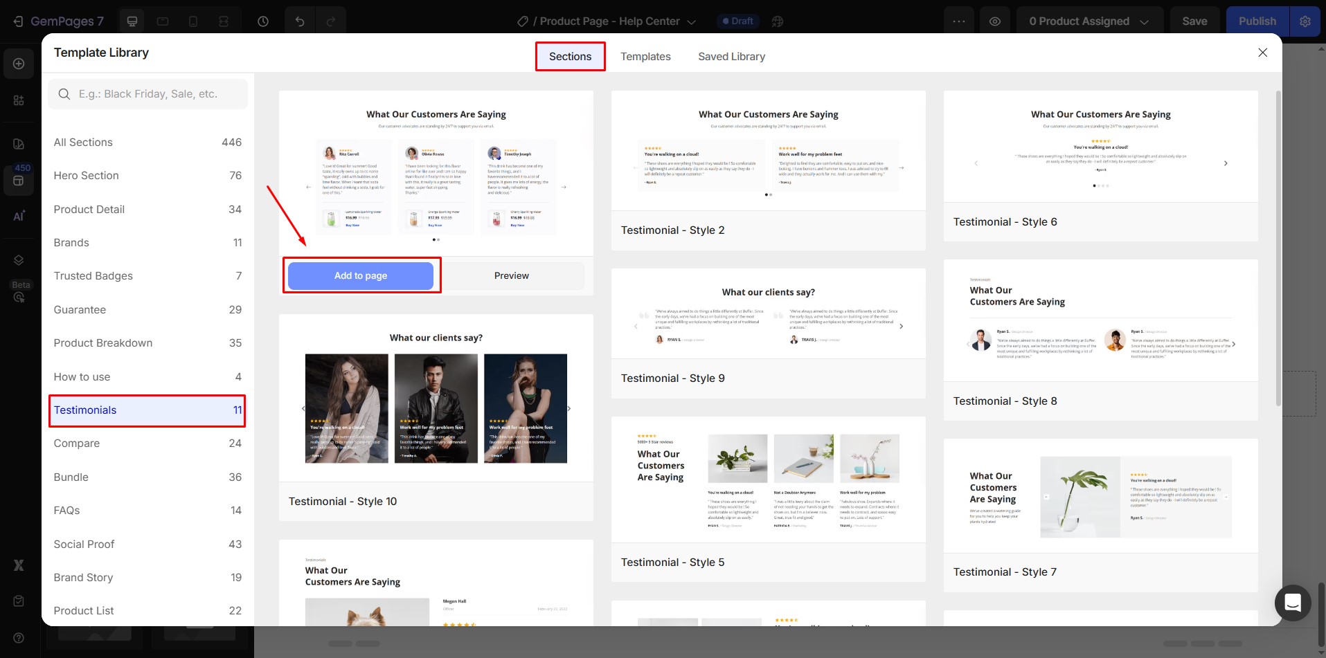 Step 2: Select “Testimonial” in “Sections”, browse the library, and choose one that suits your style. Click “Add to page” to insert it directly into your page. Make any changes if needed.