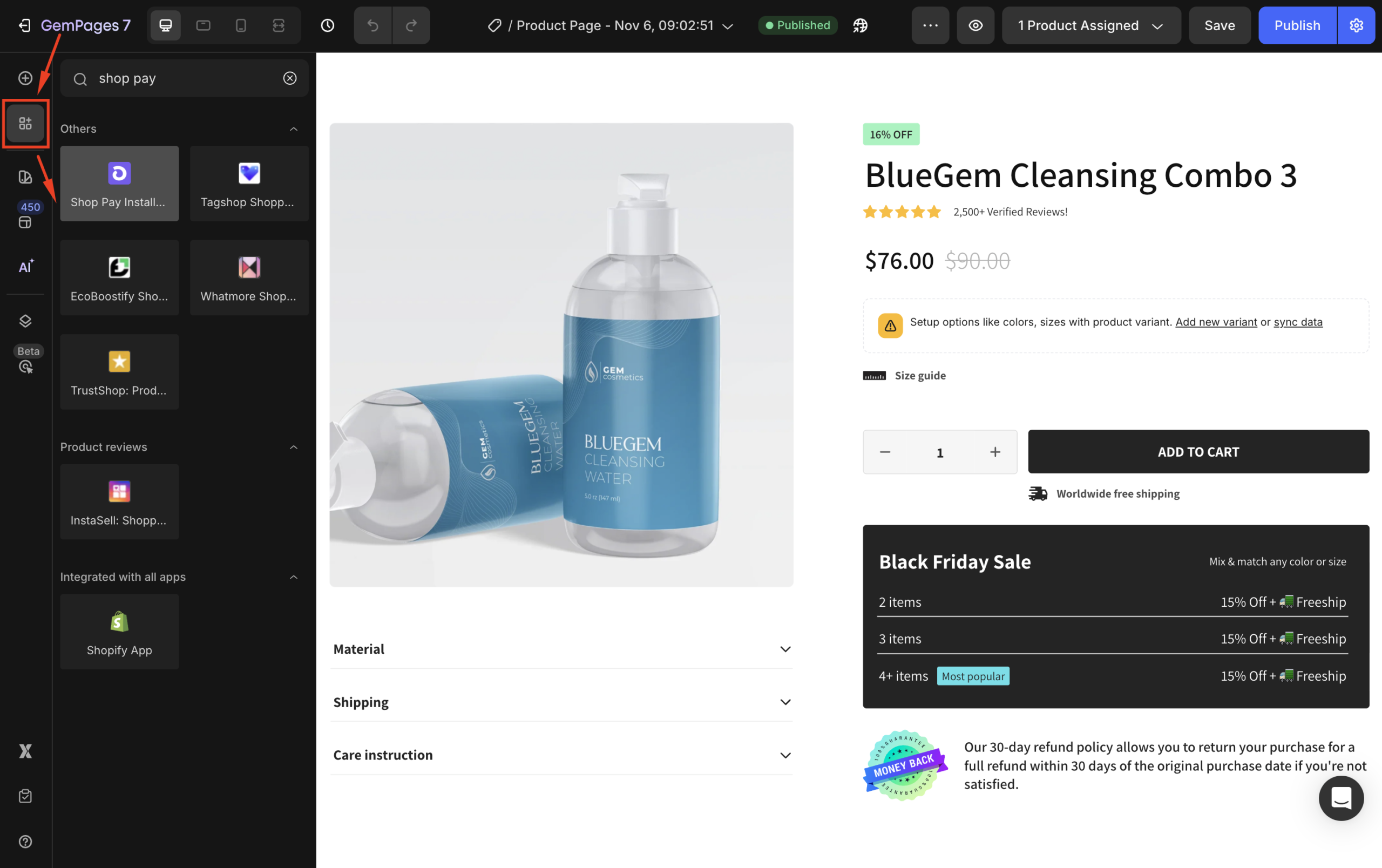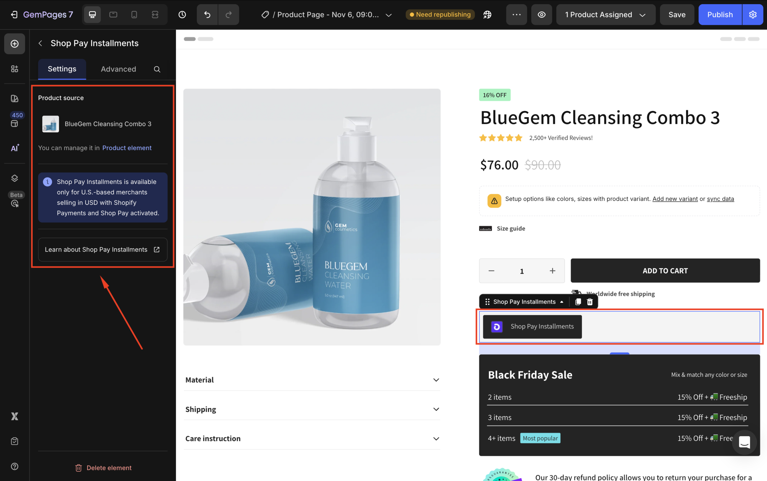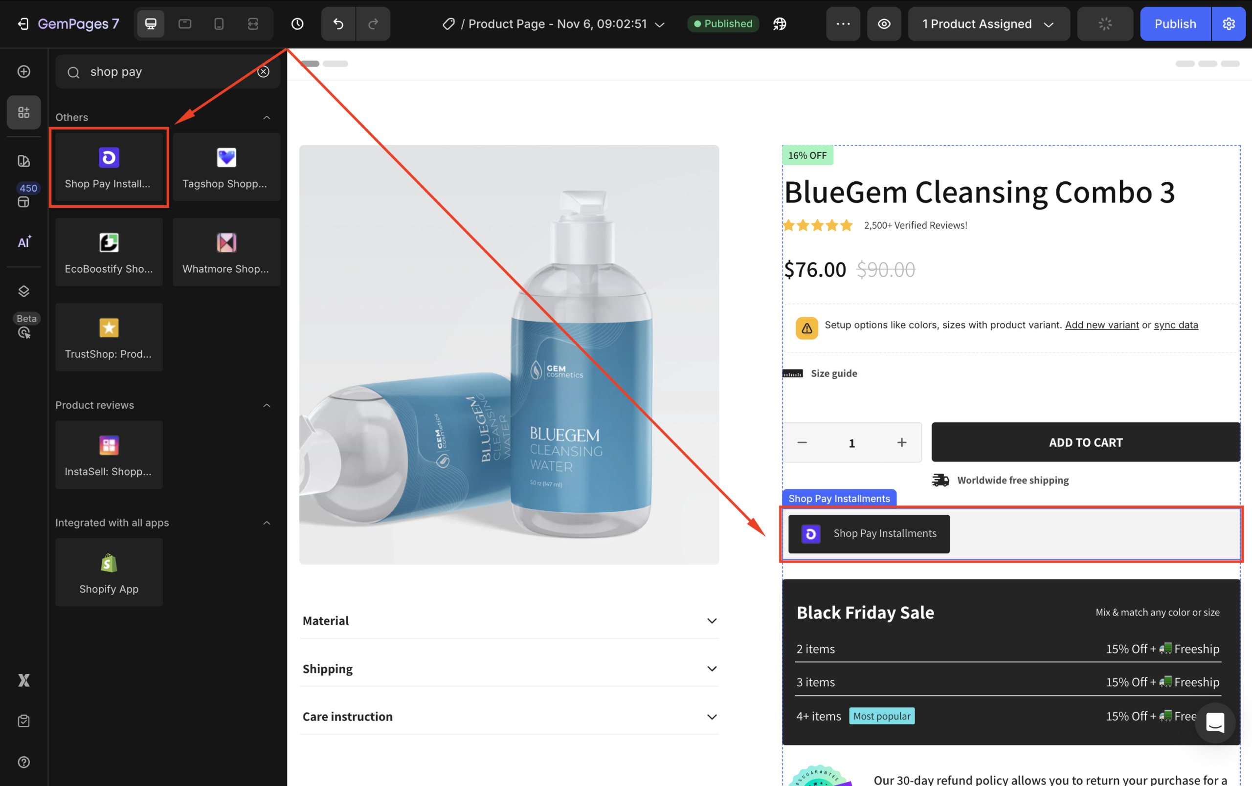 The Shop Pay Installments app is integrated with GemPages v7, which allows you to display this payment method in your product page in minutes, just drag & drop.