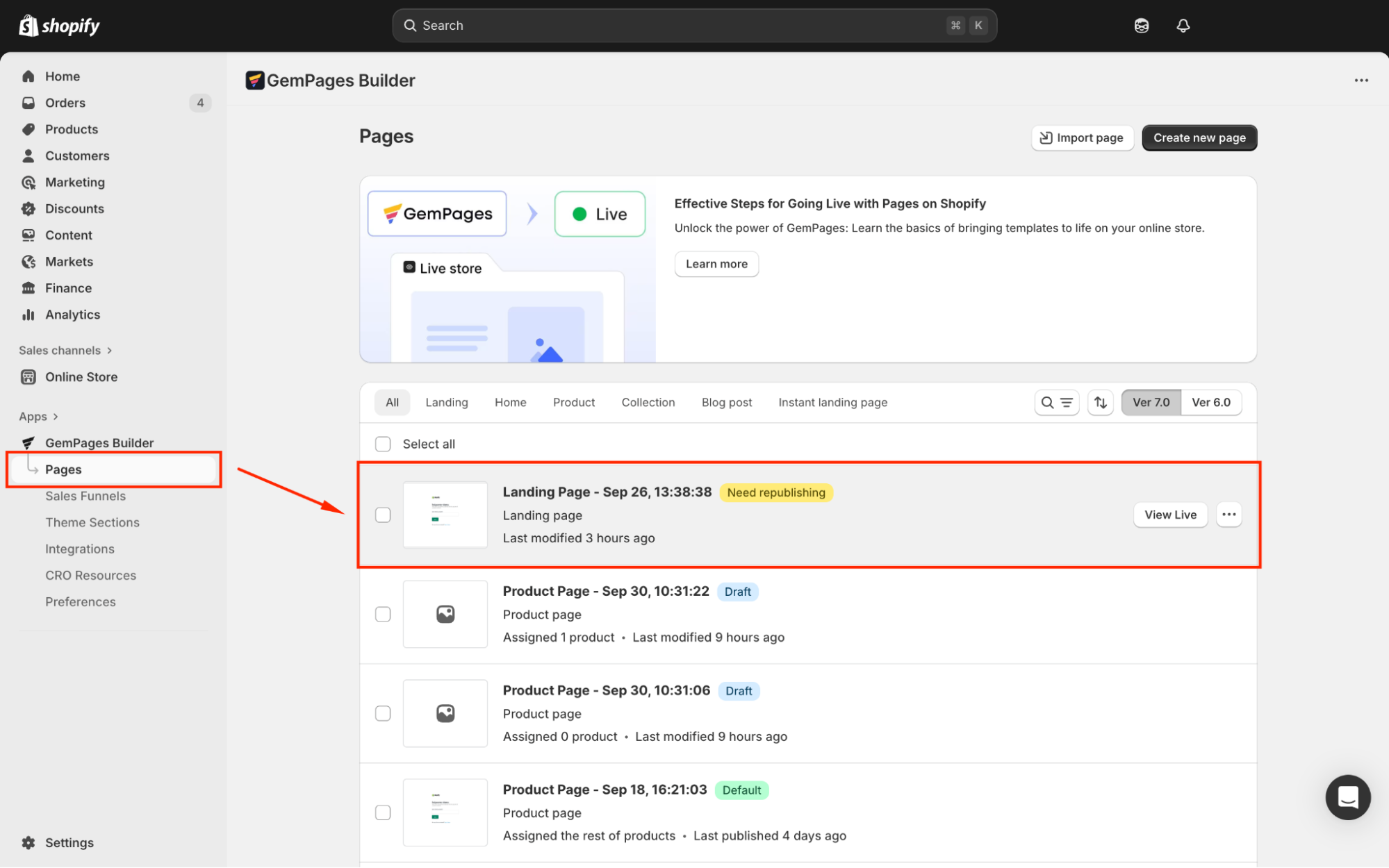 Step 1: From your Shopify admin, navigate to the GemPages Builder app > Pages. You’ll find all your pages built with GemPages there.