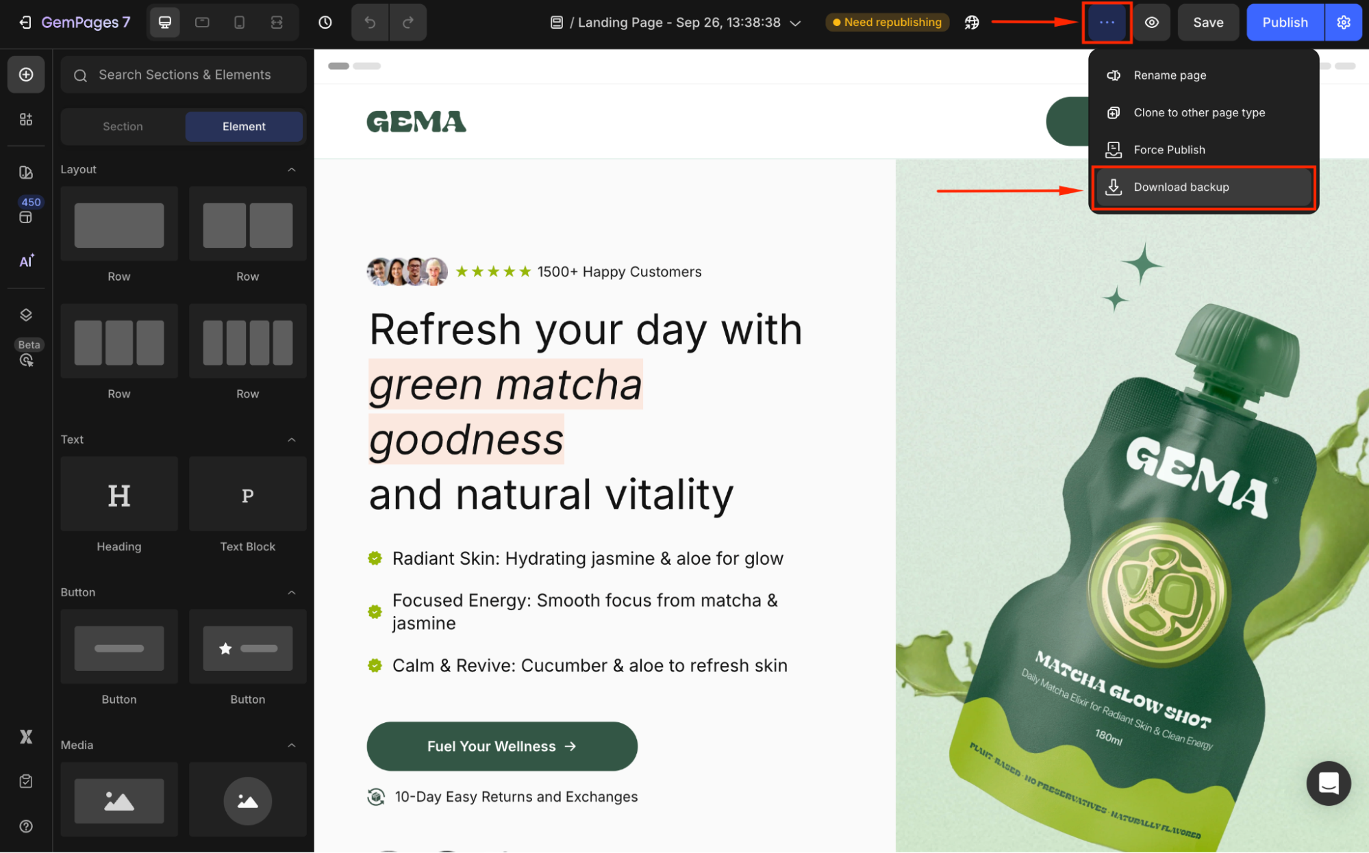 It’s recommended to create a backup before making major changes or whenever you want to save a stable version of your page outside GemPages.
