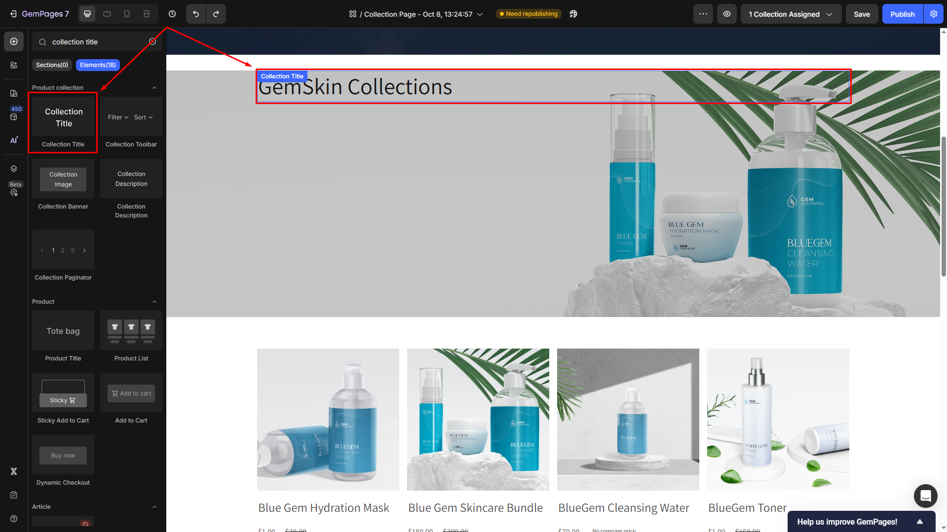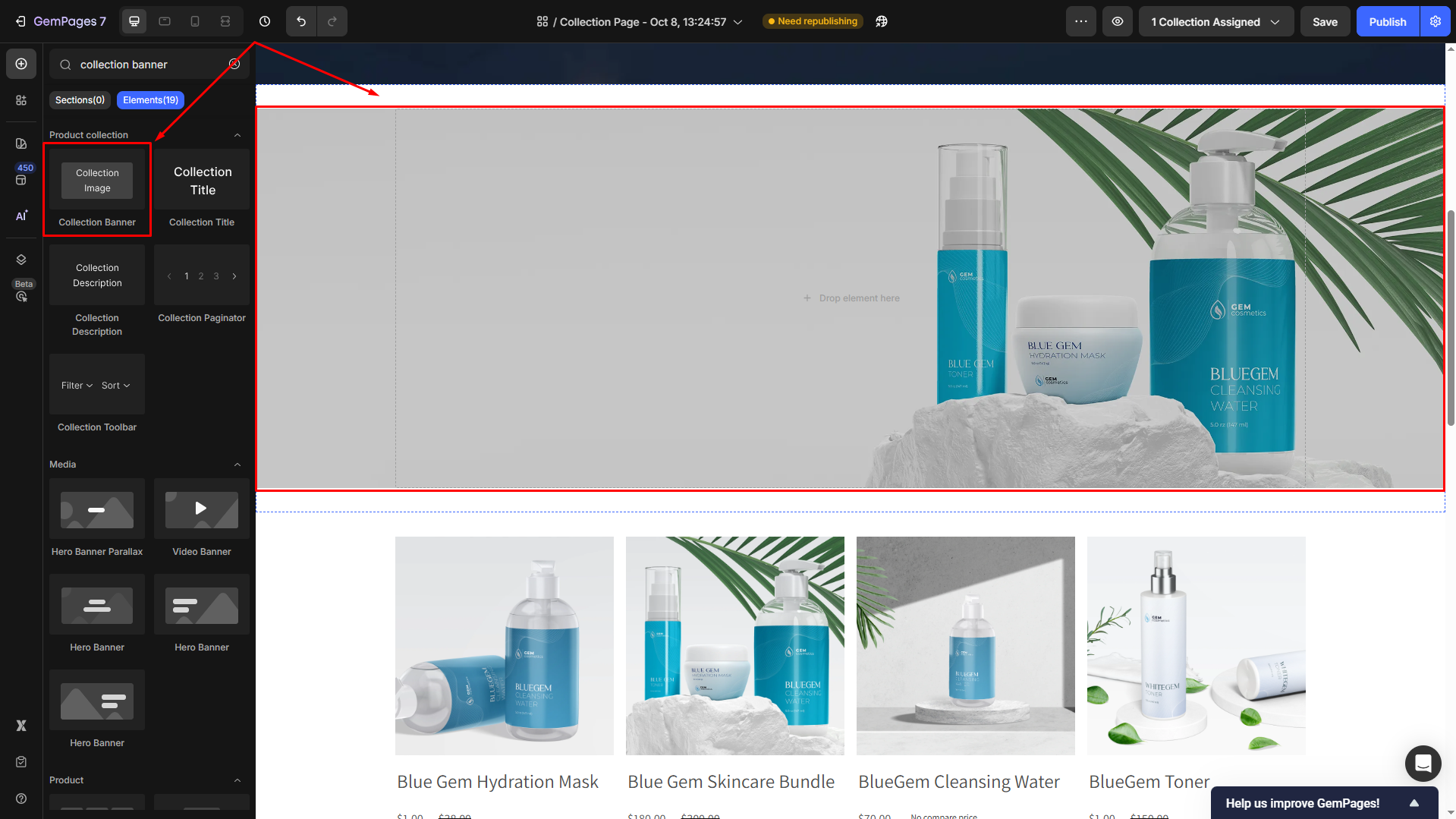 - In the GemPages editor, drag and drop the Collection Banner element onto your Collection Page layout.