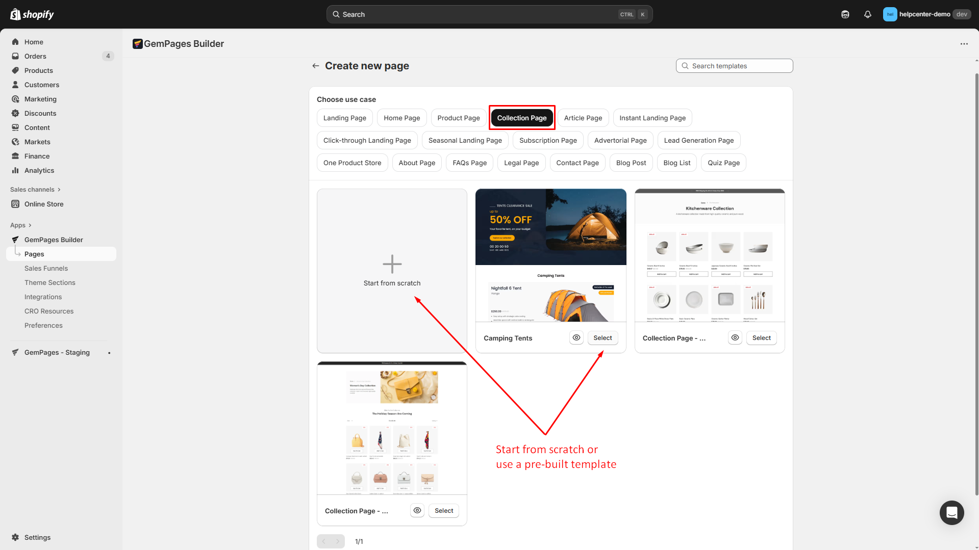 - Select Collection as the use case. Then, you can start building a new collection page from scratch (blank page) or use a pre-built template.
