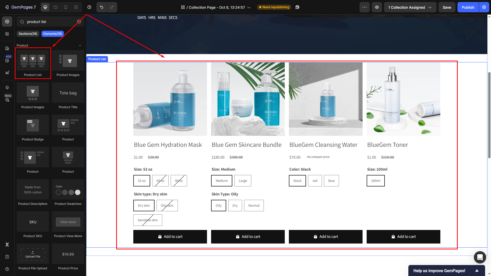 From the left sidebar, you can drag and drop several elements tailored for collection, such as the Product List Element.