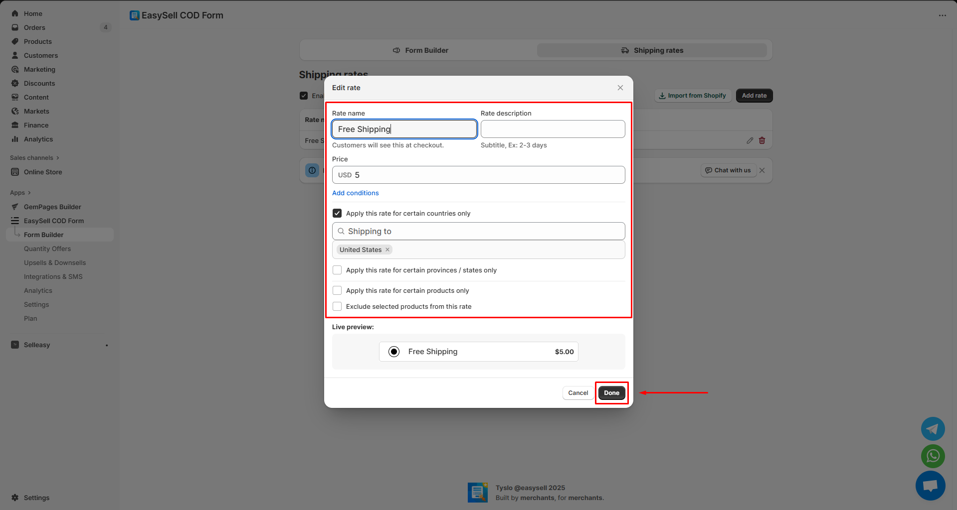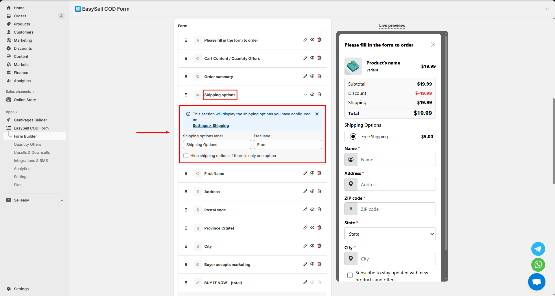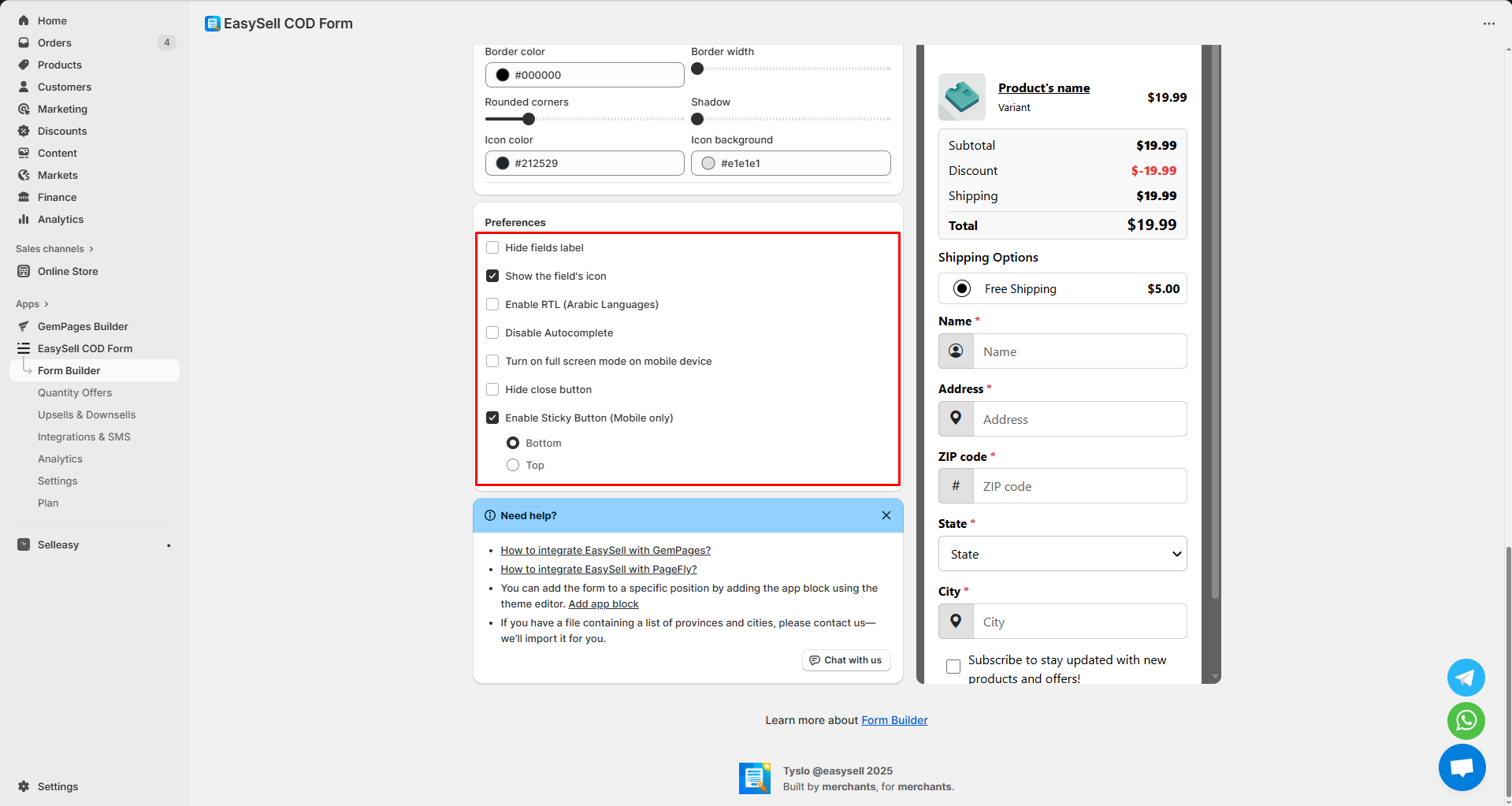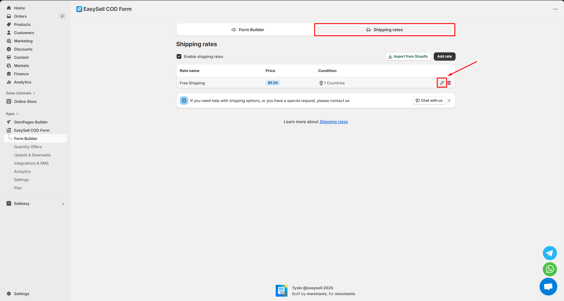 In the Form Builder section, EasySell allows you to configure the Form Builder and Shipping rates.