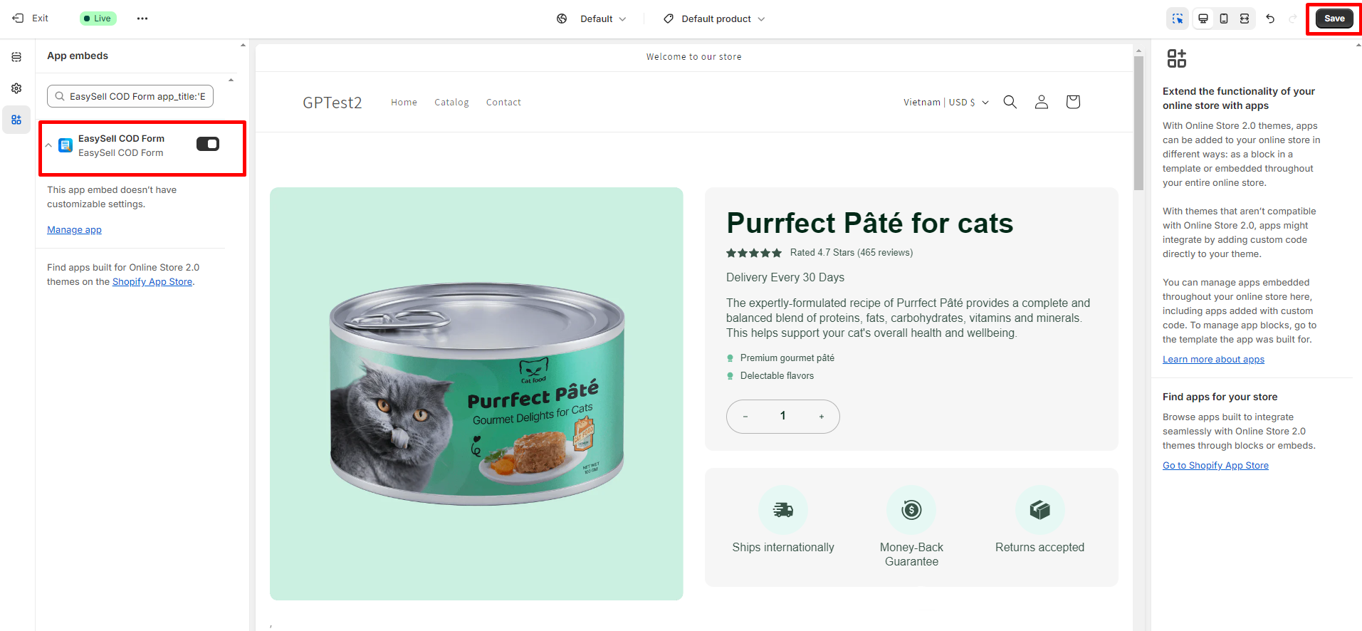 Step 3: To enable the app, open your theme, make sure the app embed is on, and click the “Save” button in the top right corner.