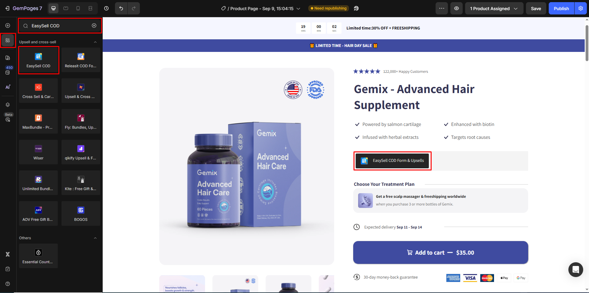 EasySell COD Form & Upsells integrates with GemPages v7, so you can add the COD form to any GemPages-built product page directly in the editor without using custom code.