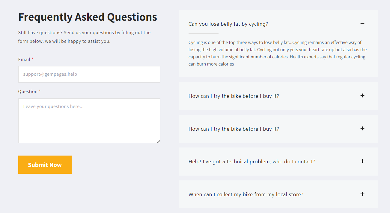 A commonly use case for accordion design is the FAQs page, where multiple questions are listed, and viewers can simply click on a question to reveal the answer they seek: