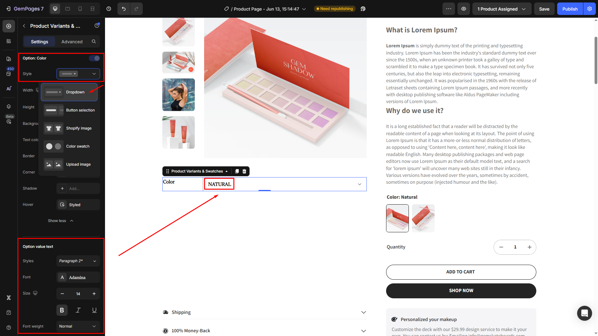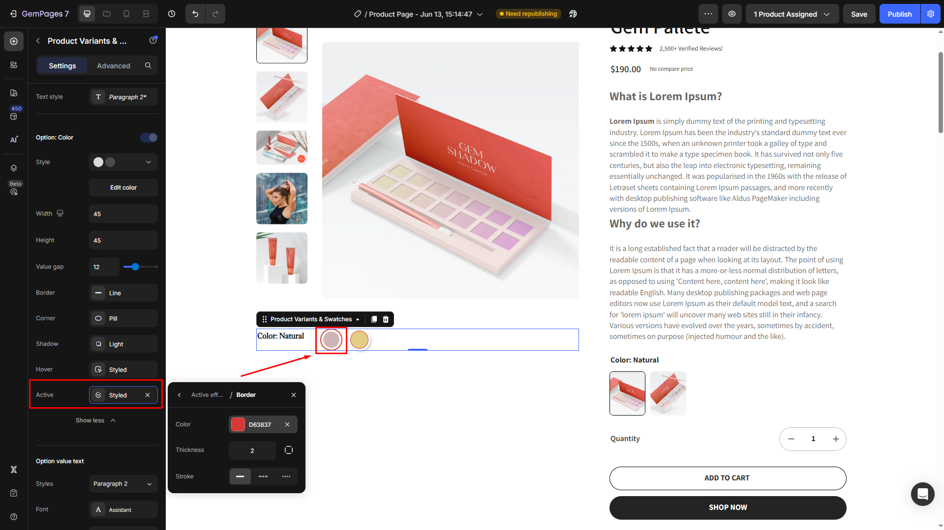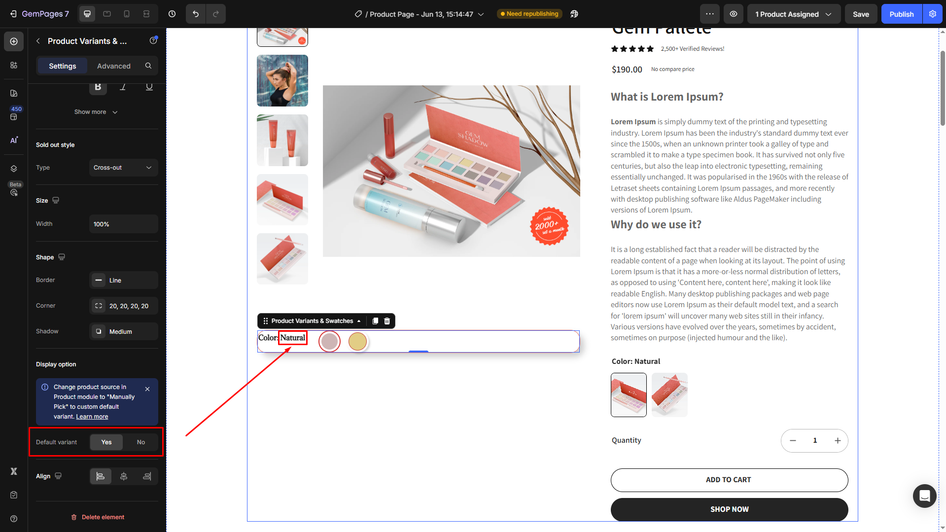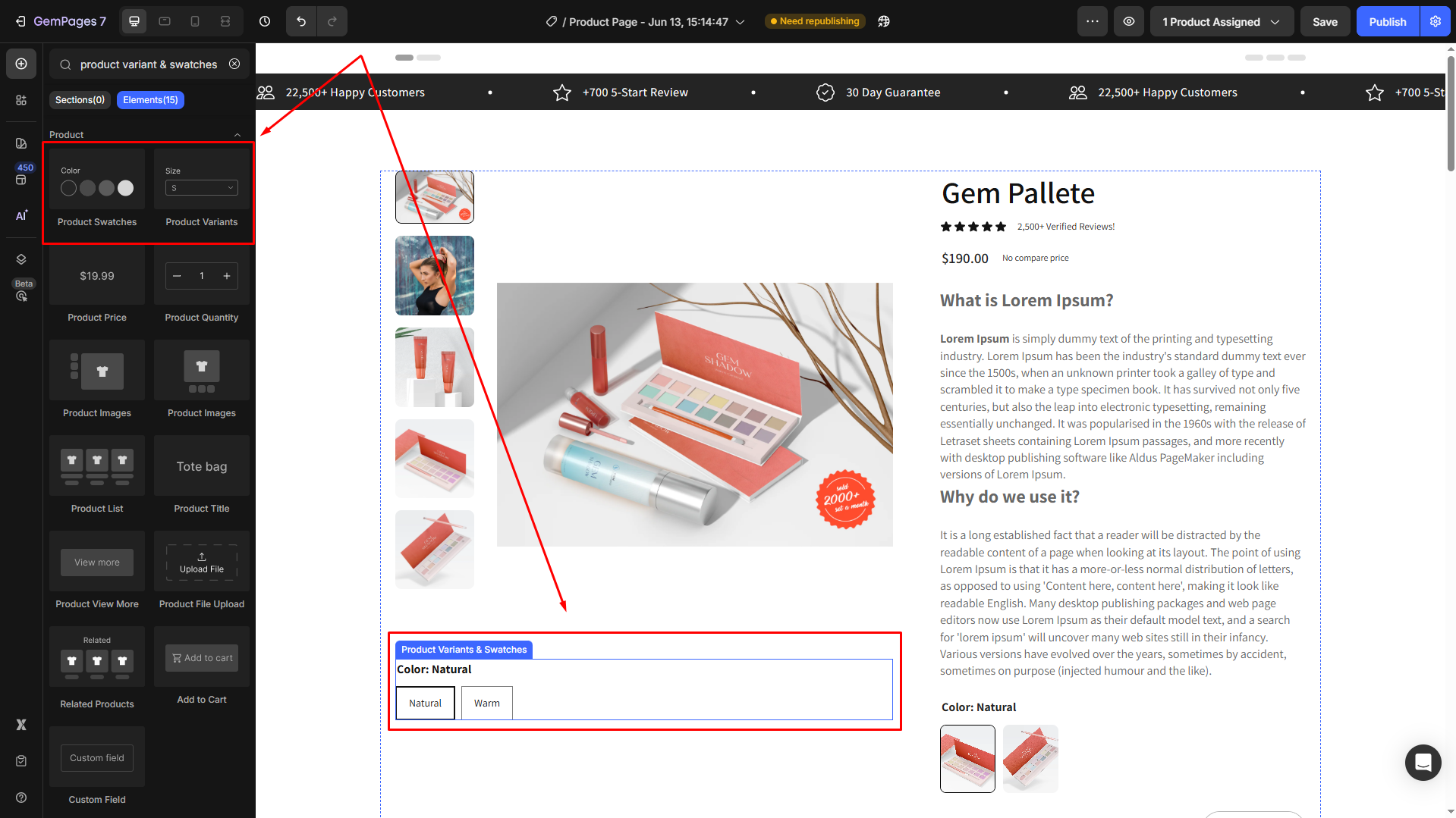 Follow these steps to add a Product Variant & Swatches to your page built with GemPages.