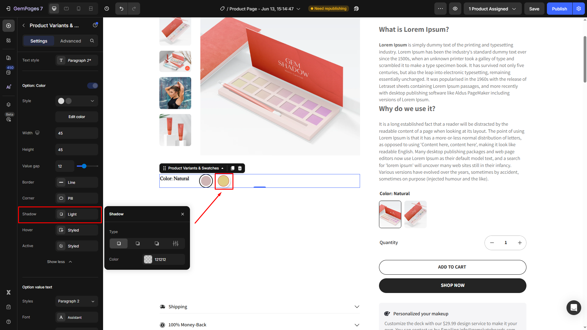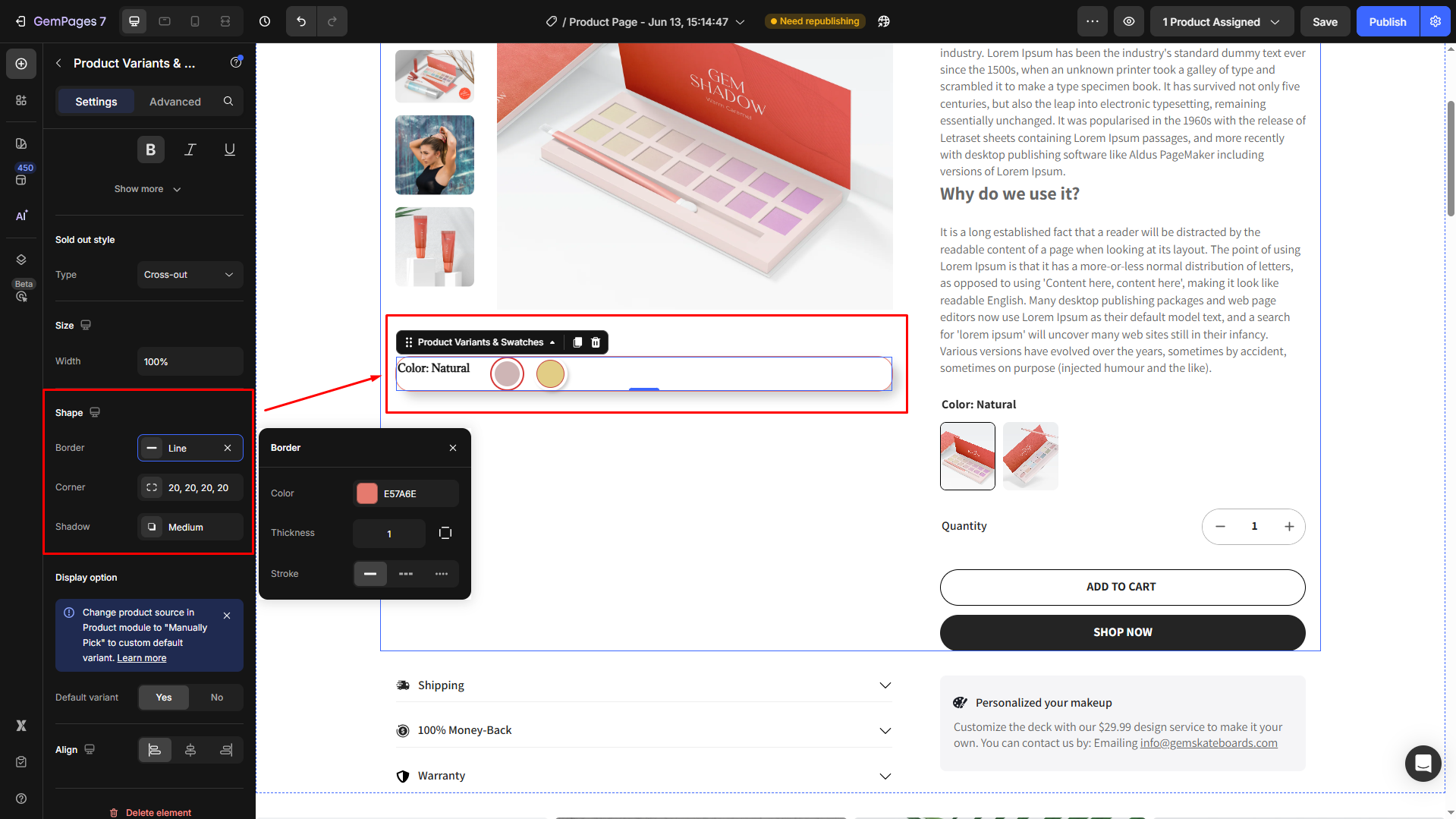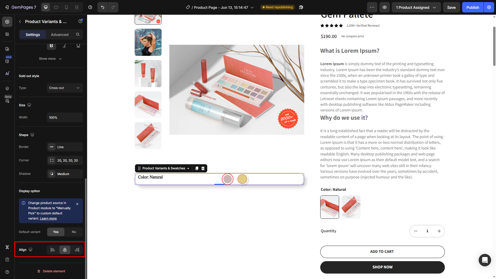 Follow these steps to add a Product Variant & Swatches to your page built with GemPages.