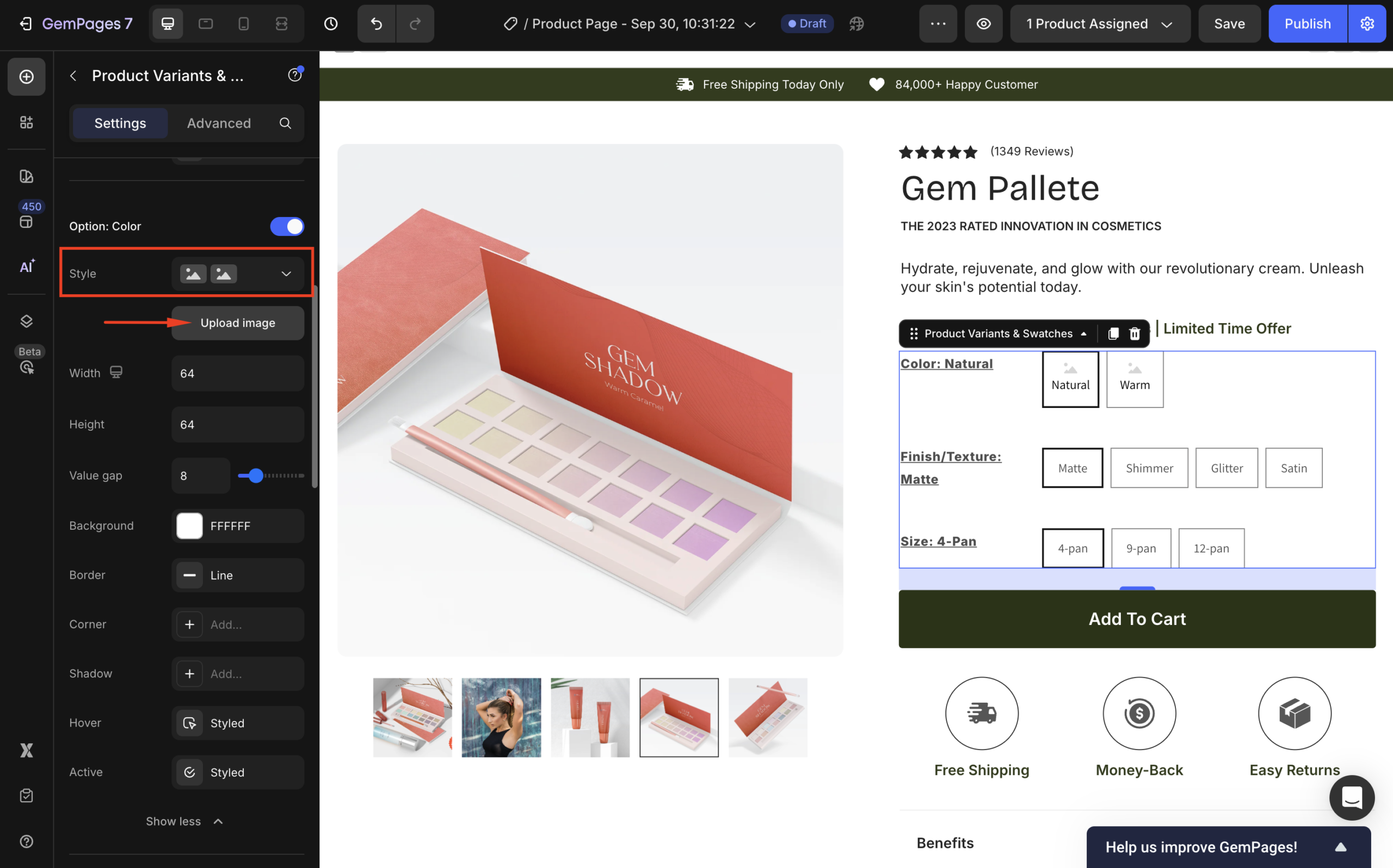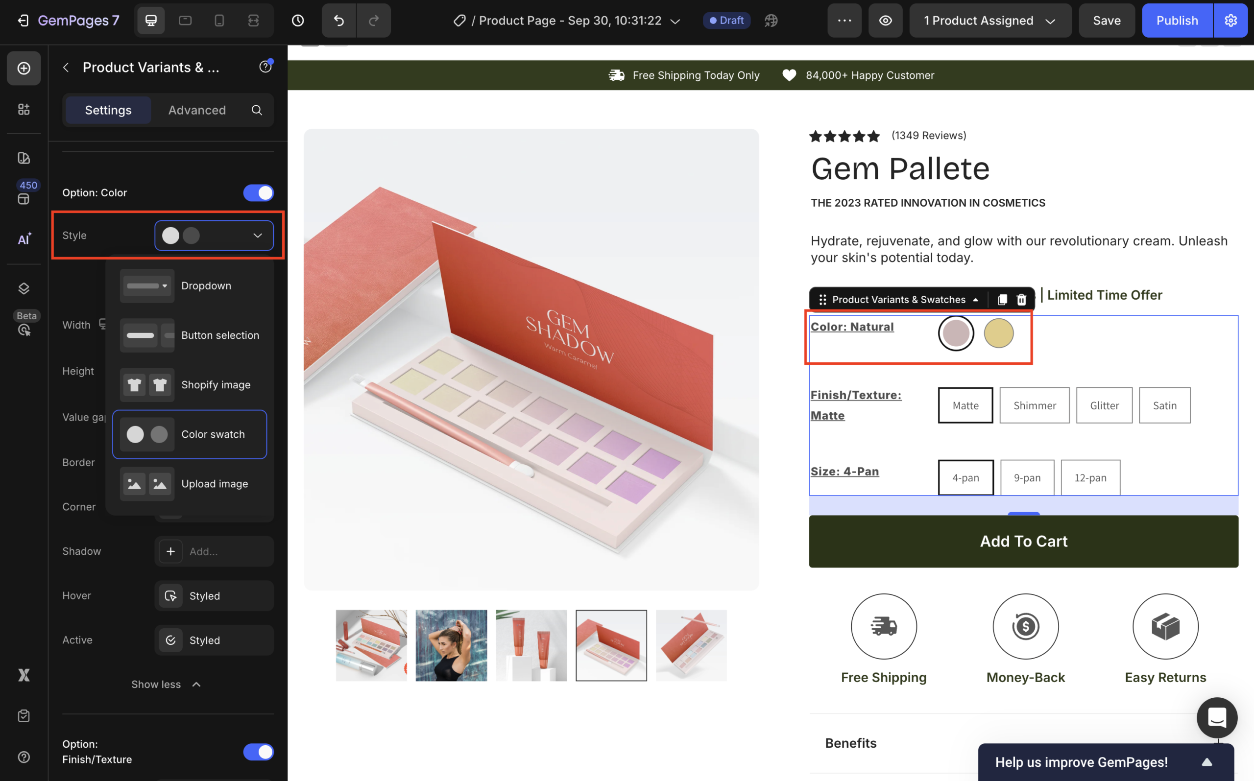 In GemPages V7, the Product Variants and Swatches element lets you display all product variant options in a single, customizable interface, from dropdowns to color swatches to image thumbnails.