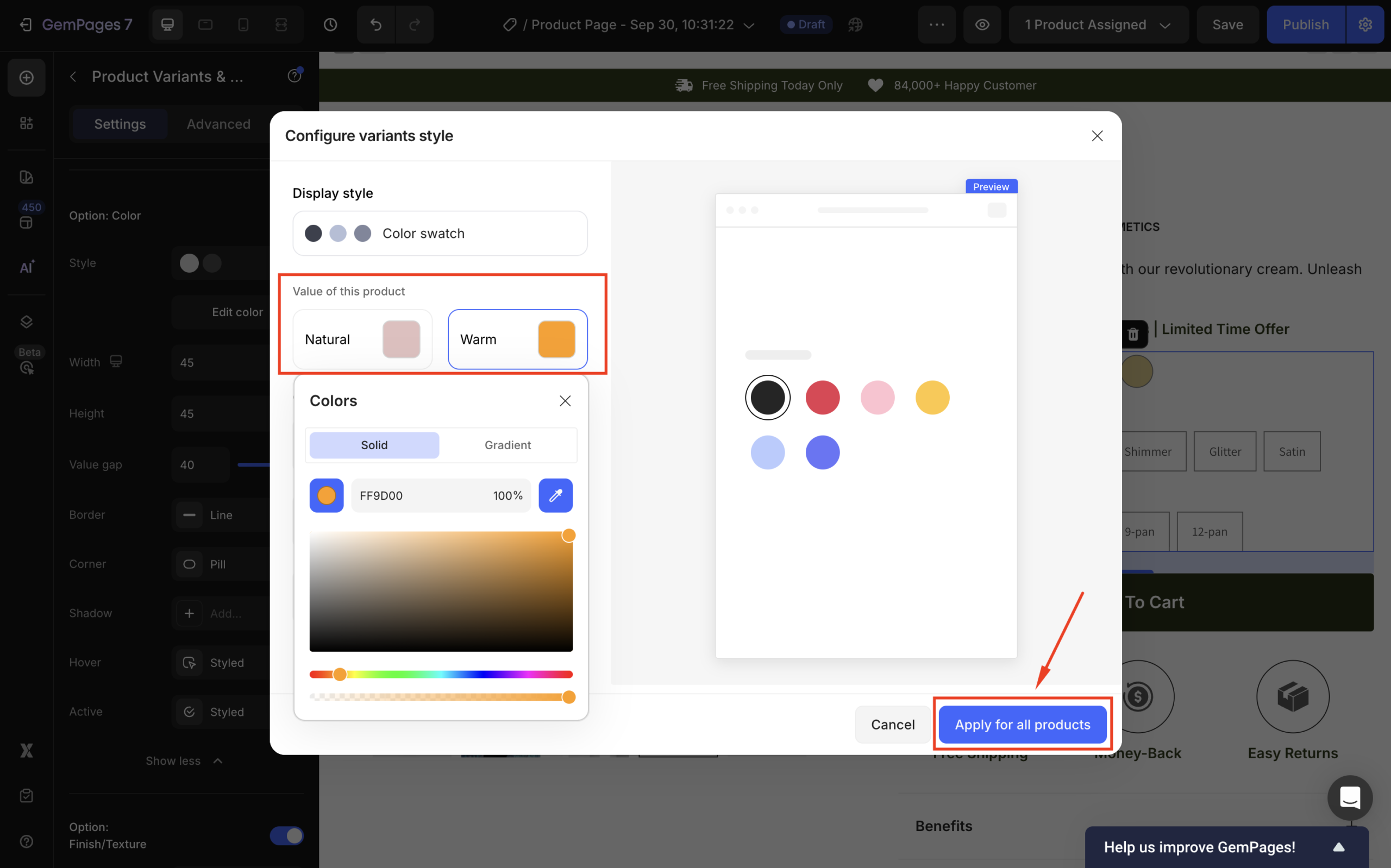 If one of your color swatches isn’t functioning correctly in GemPages, here are some steps to troubleshoot and resolve the issue: