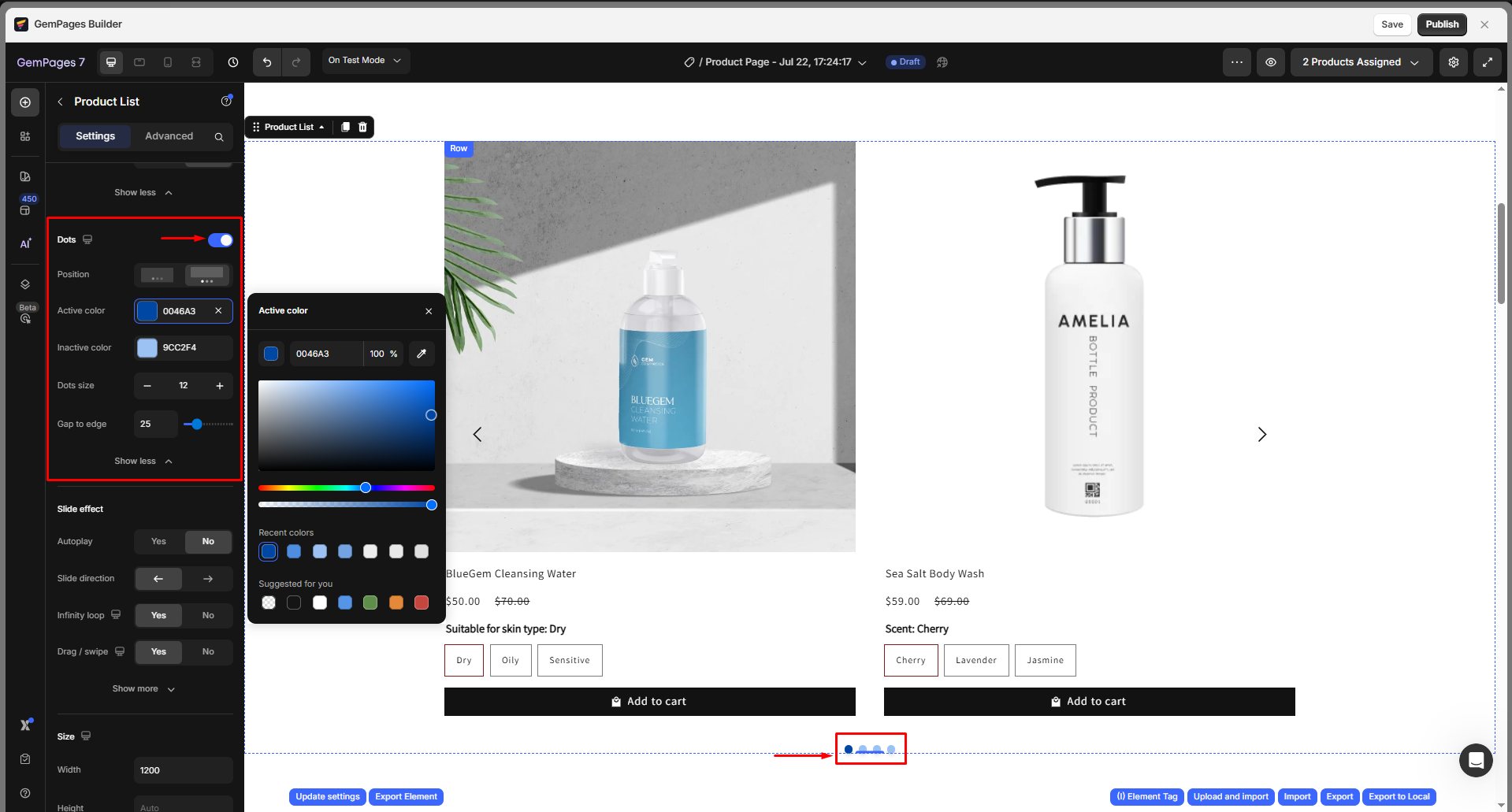 Toggle the visibility of the dots below the slider to configure the Dots settings to show pagination indicators below your slider, including: