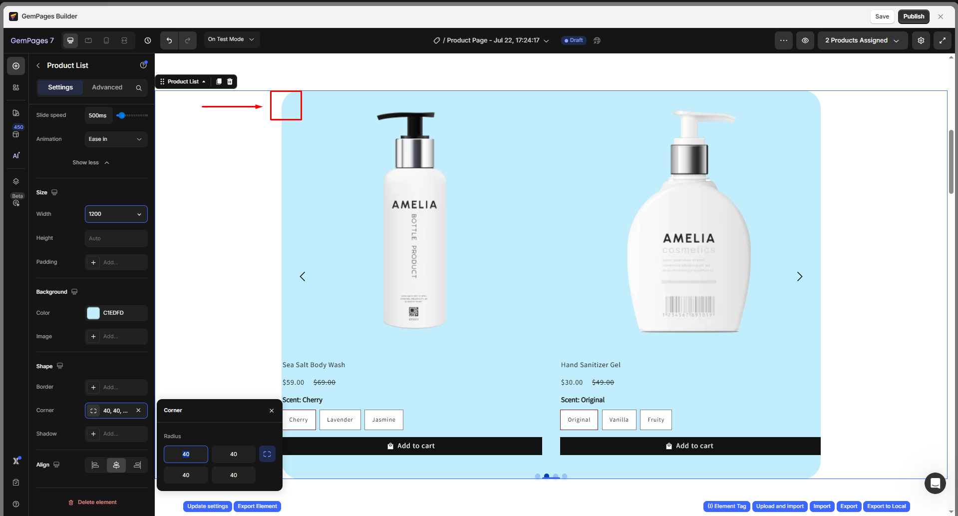 In this section, you can shape the corners of the Product List container: