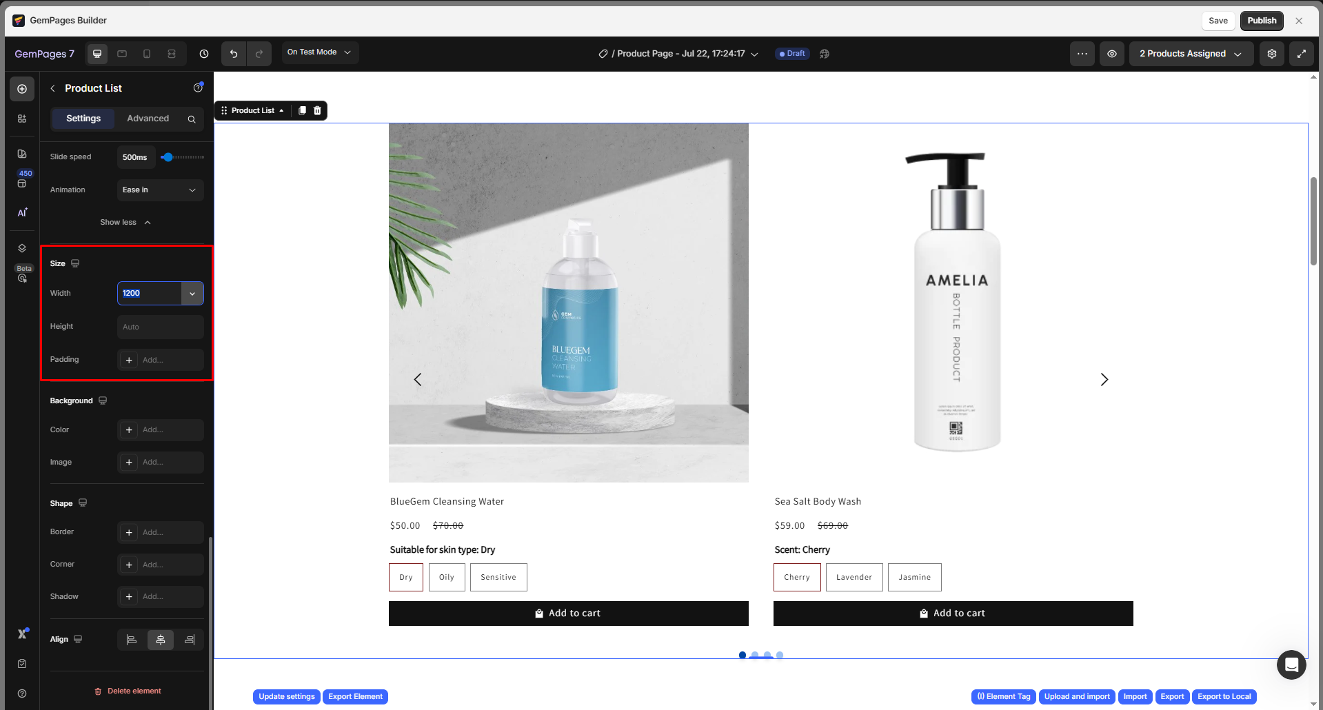 In this section, you can define the size of the Product List container, including: