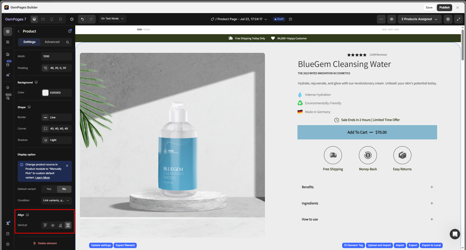 Under the Align section, configure the vertical alignment for your Product Element. You can select from: