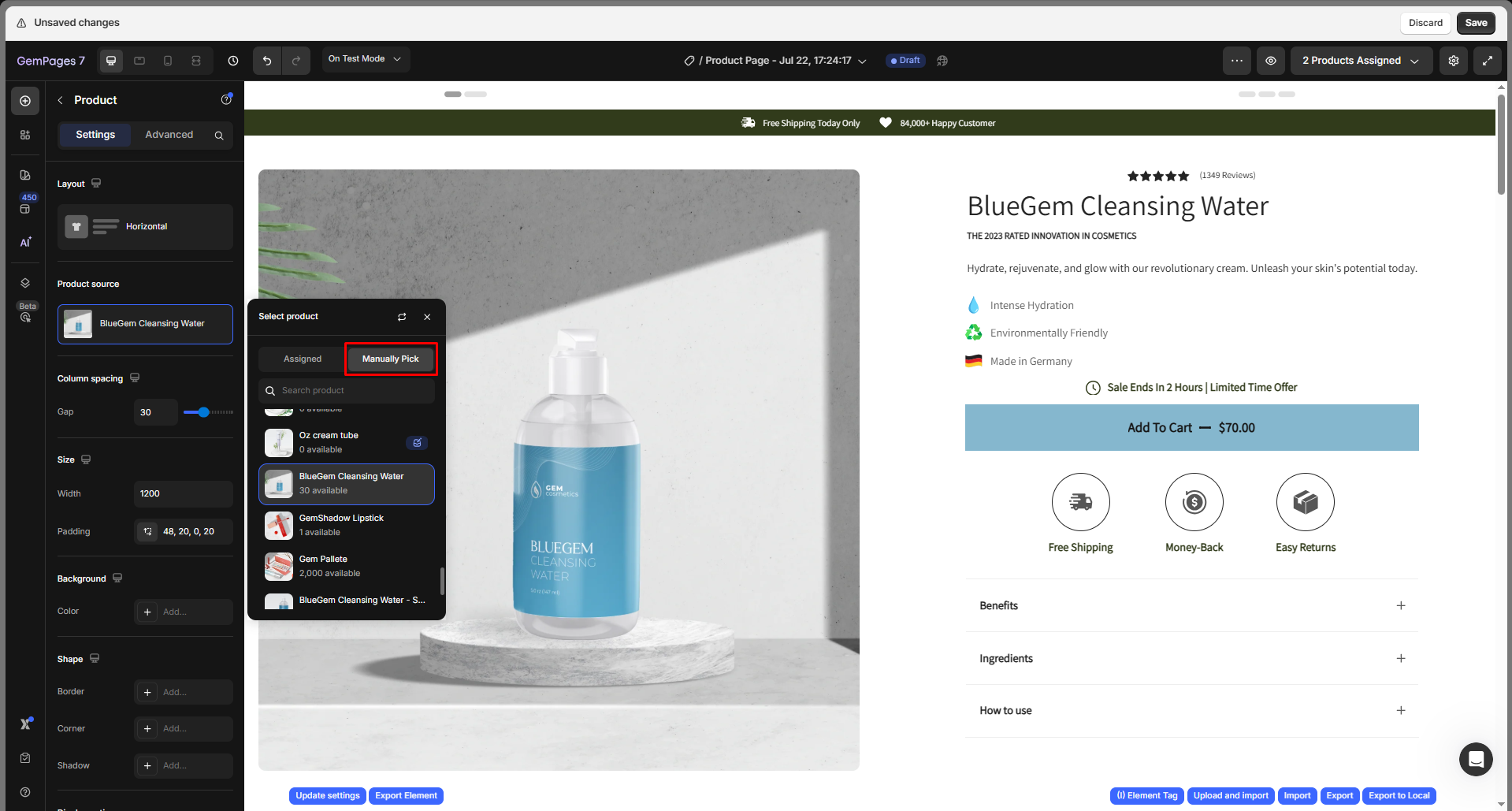 If your page is a product page, you can change the product source from two options: Display by assigned product or Manually Pick.
