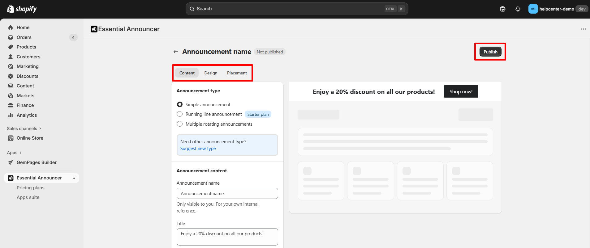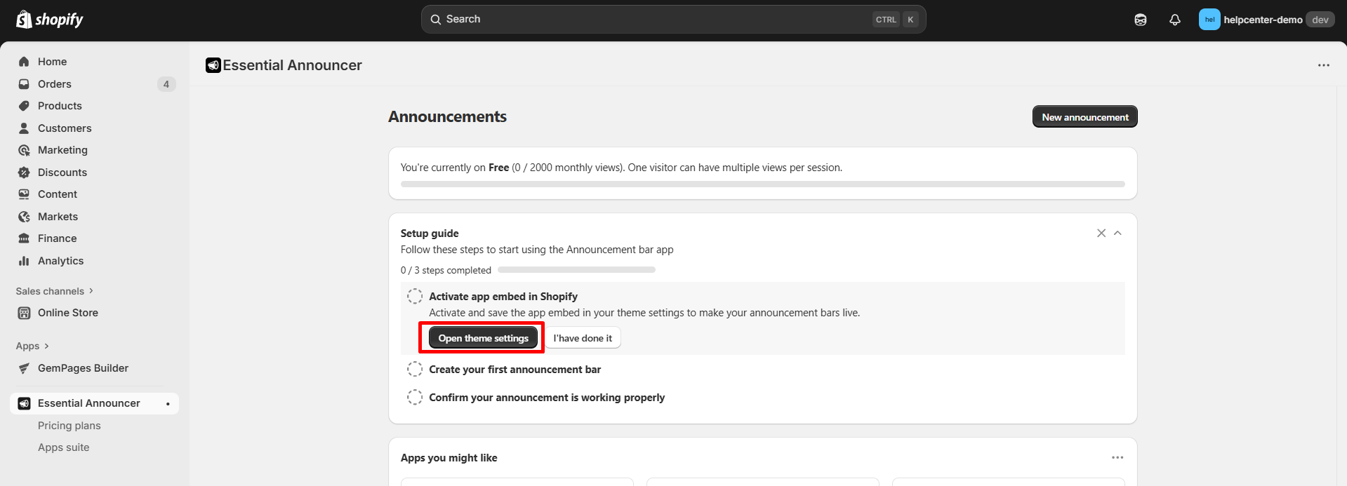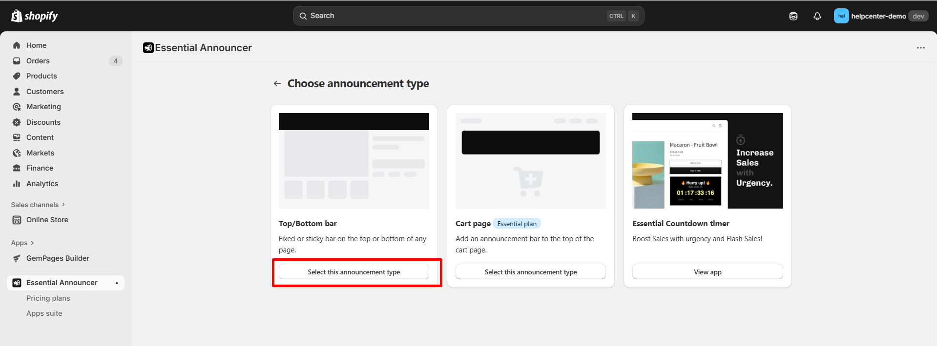Step 4: Open the Essential Announcement Bar app. Get started by clicking on the “Create new announcement” button.