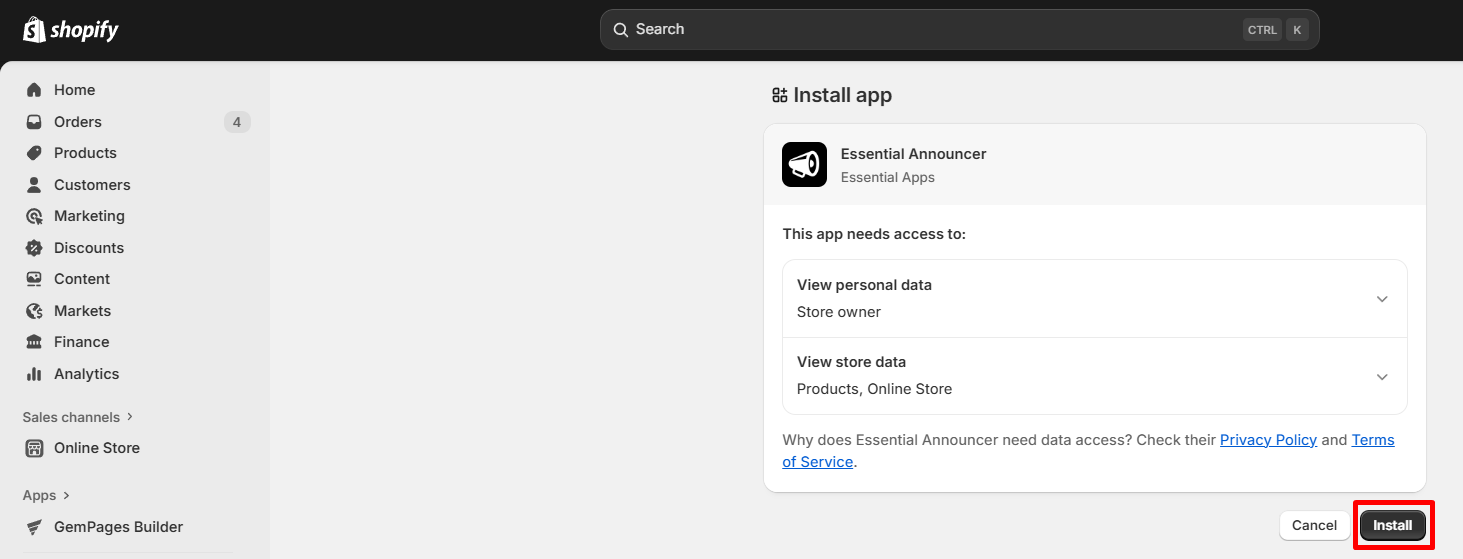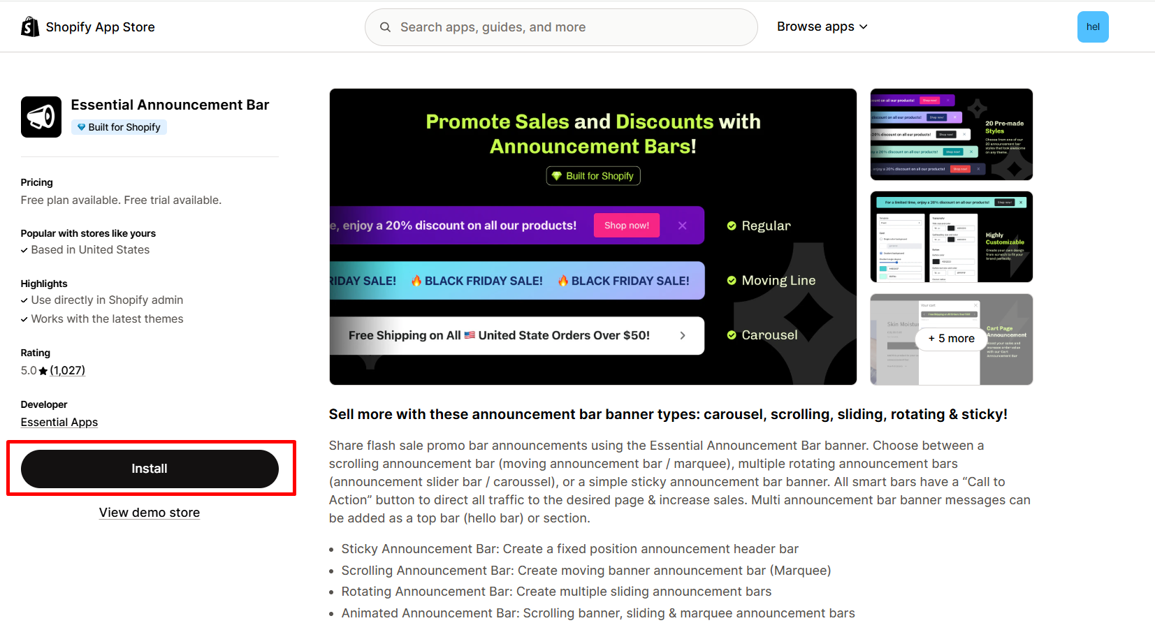 Step 1: Install Essential Announcement Bar in the Shopify App Store.