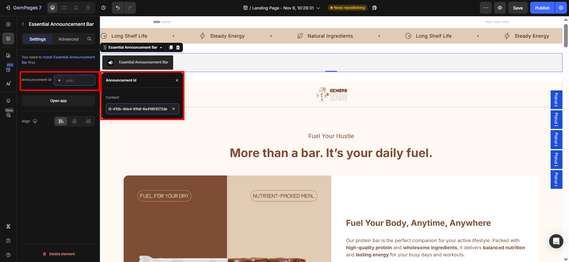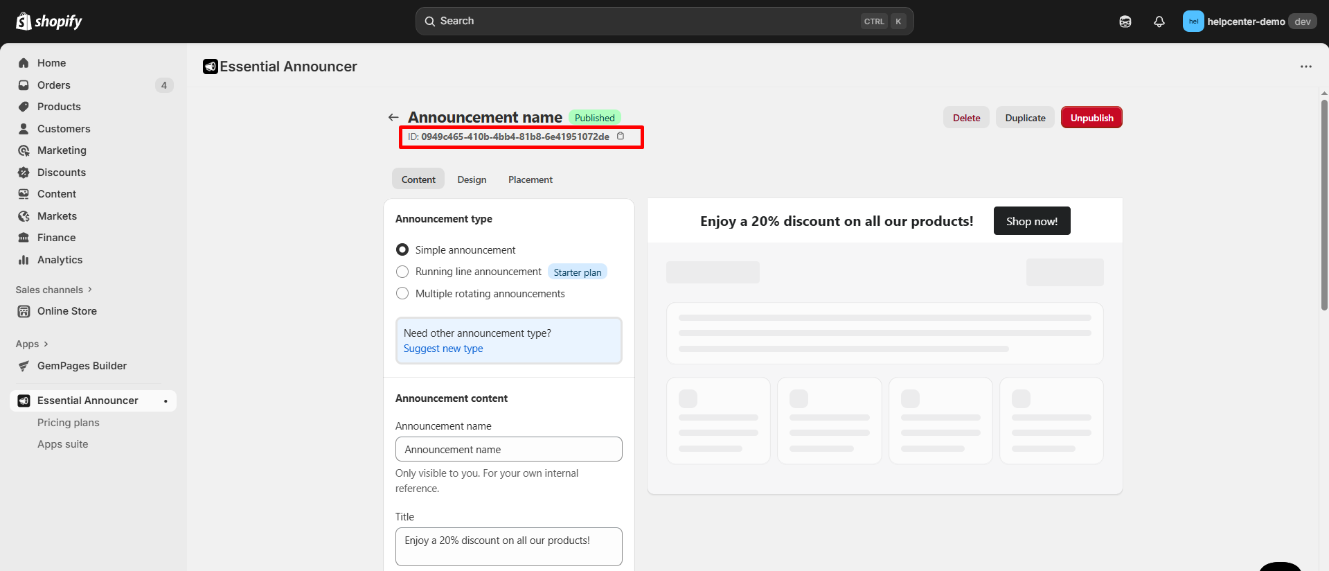 Step 7: Copy the Announcement Bar ID for later use with GemPages integration.