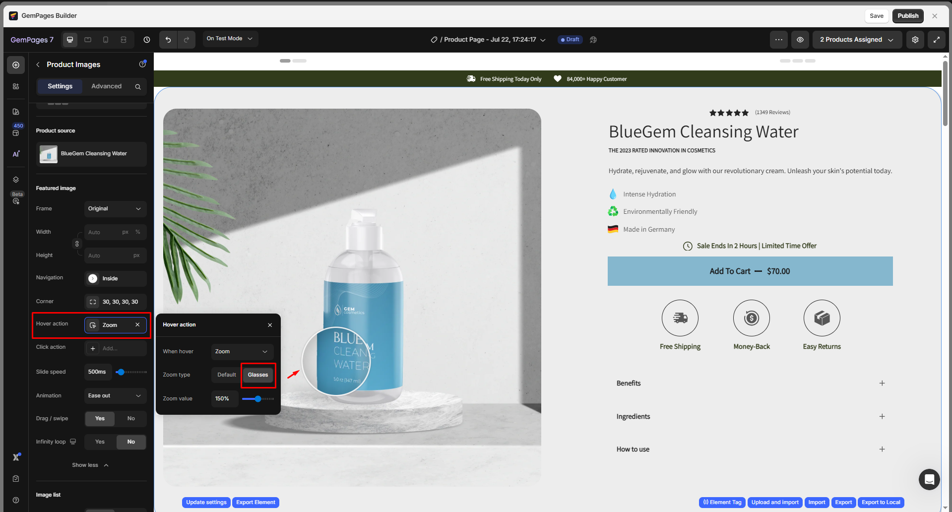 | Hover Action | Add hover effects such as Zoom. You can also customize: → Zoom Type: Default / Glasses → Zoom Value: Set zoom percentage