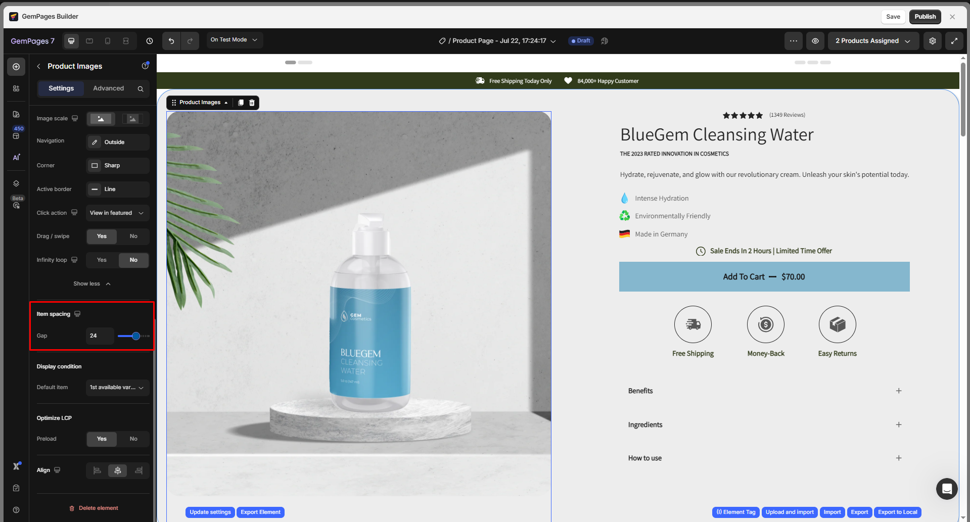 Step 3: Once the product is assigned, the Product Images element inside the module will automatically pull and display the product’s images from the Shopify Admin.