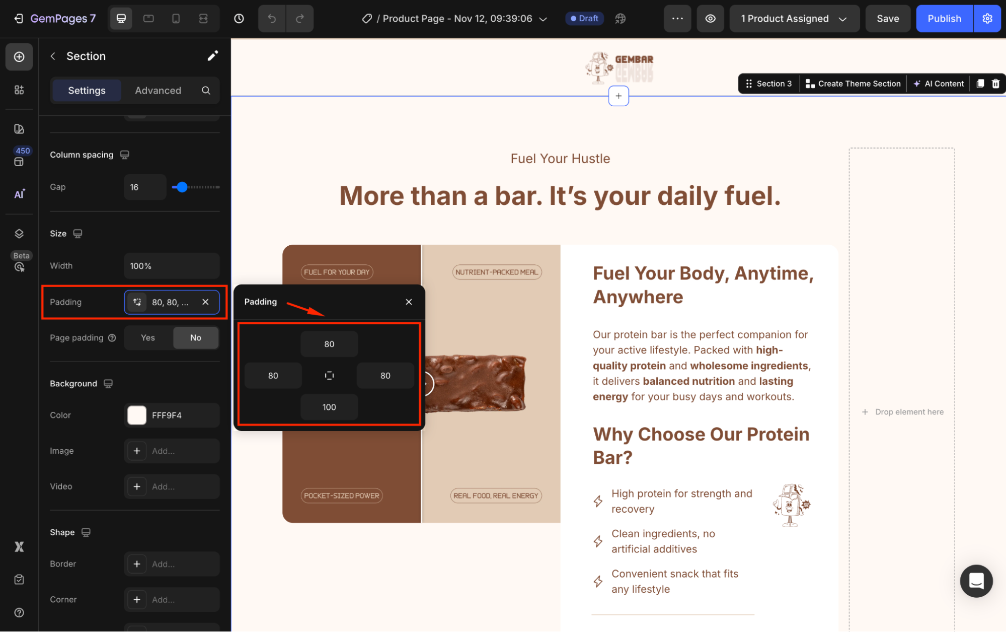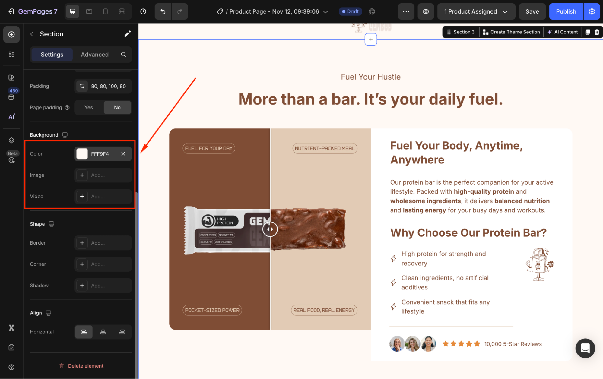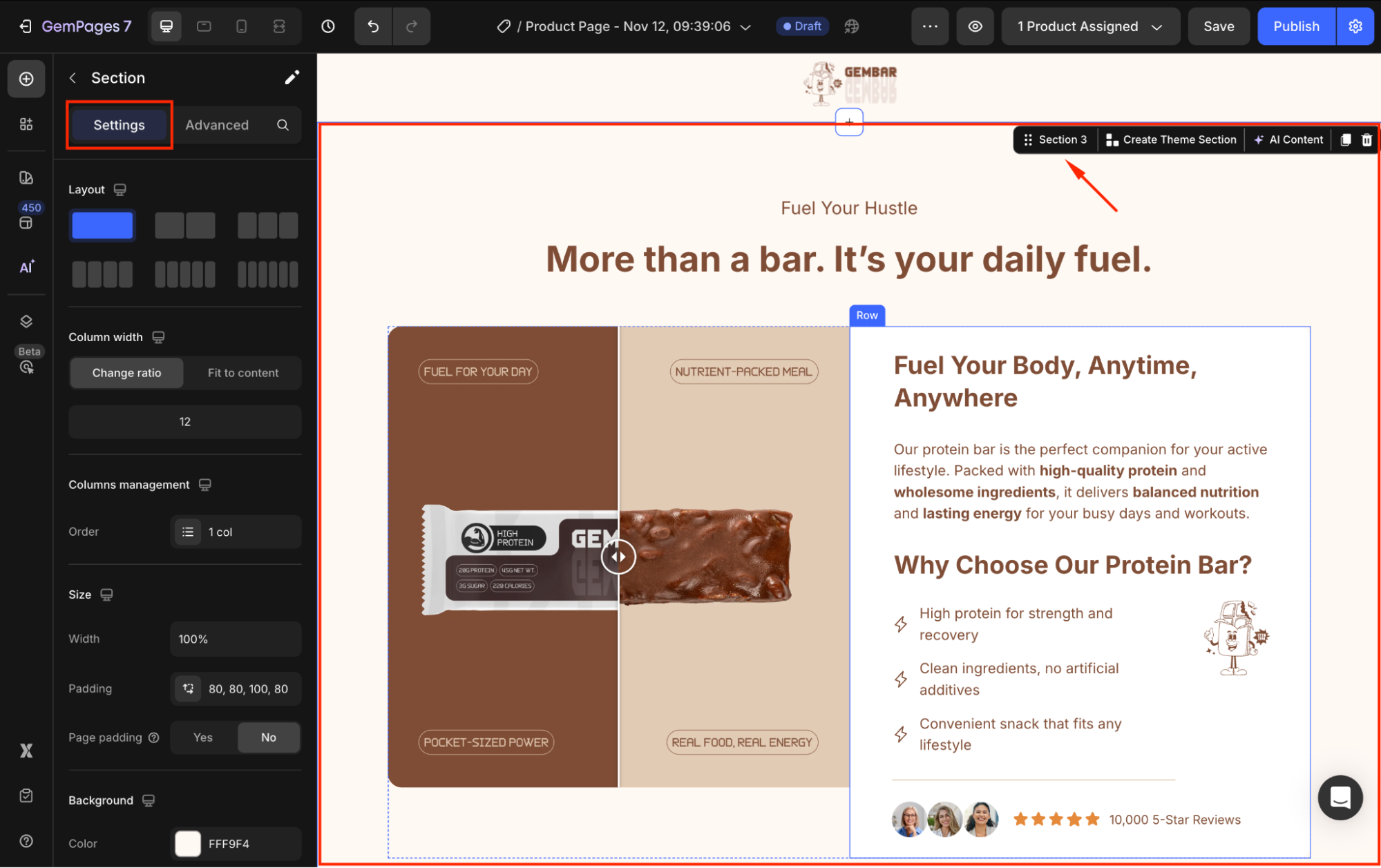 In the GemPages Editor, click on the target section to open its settings panel on your left side.