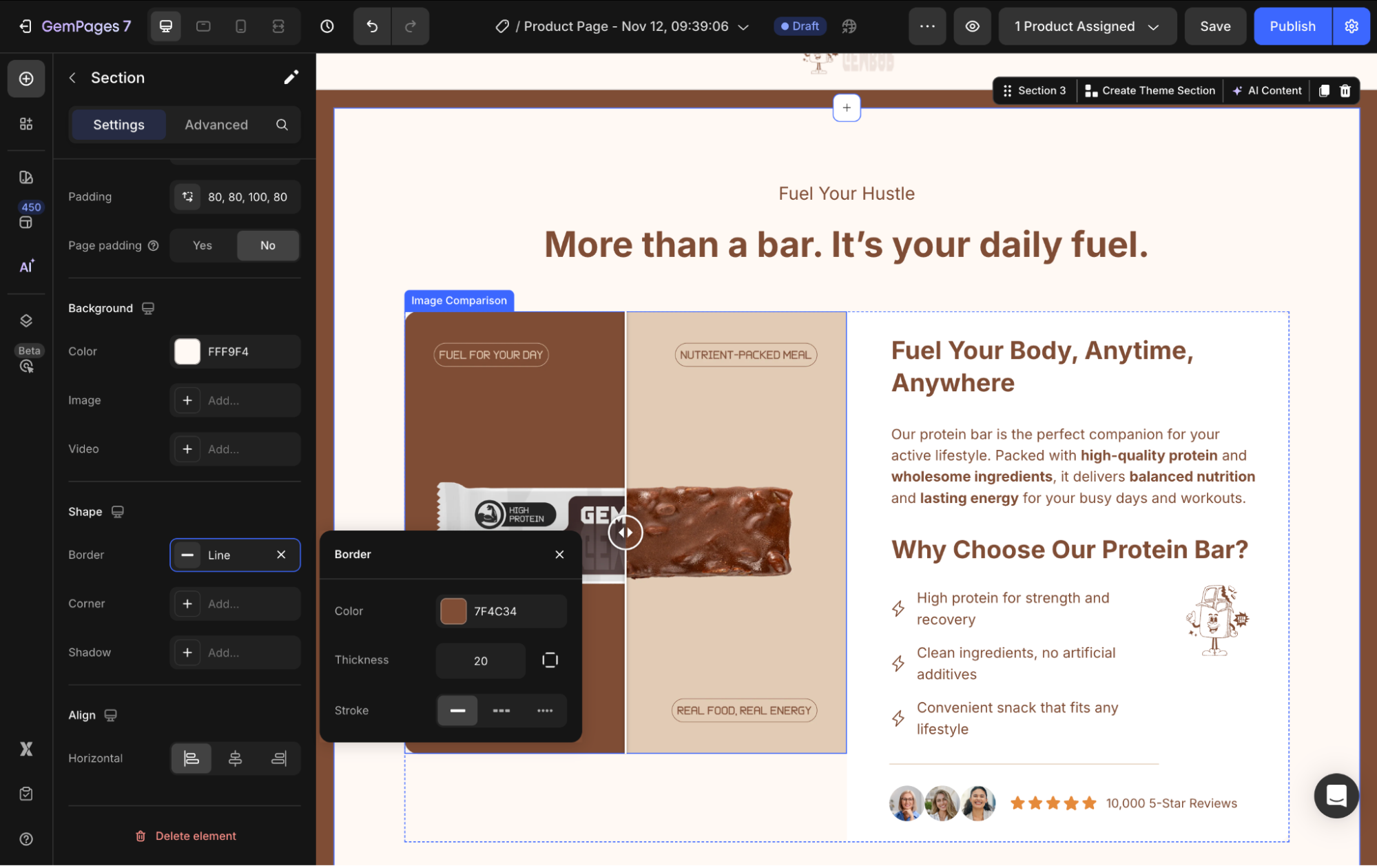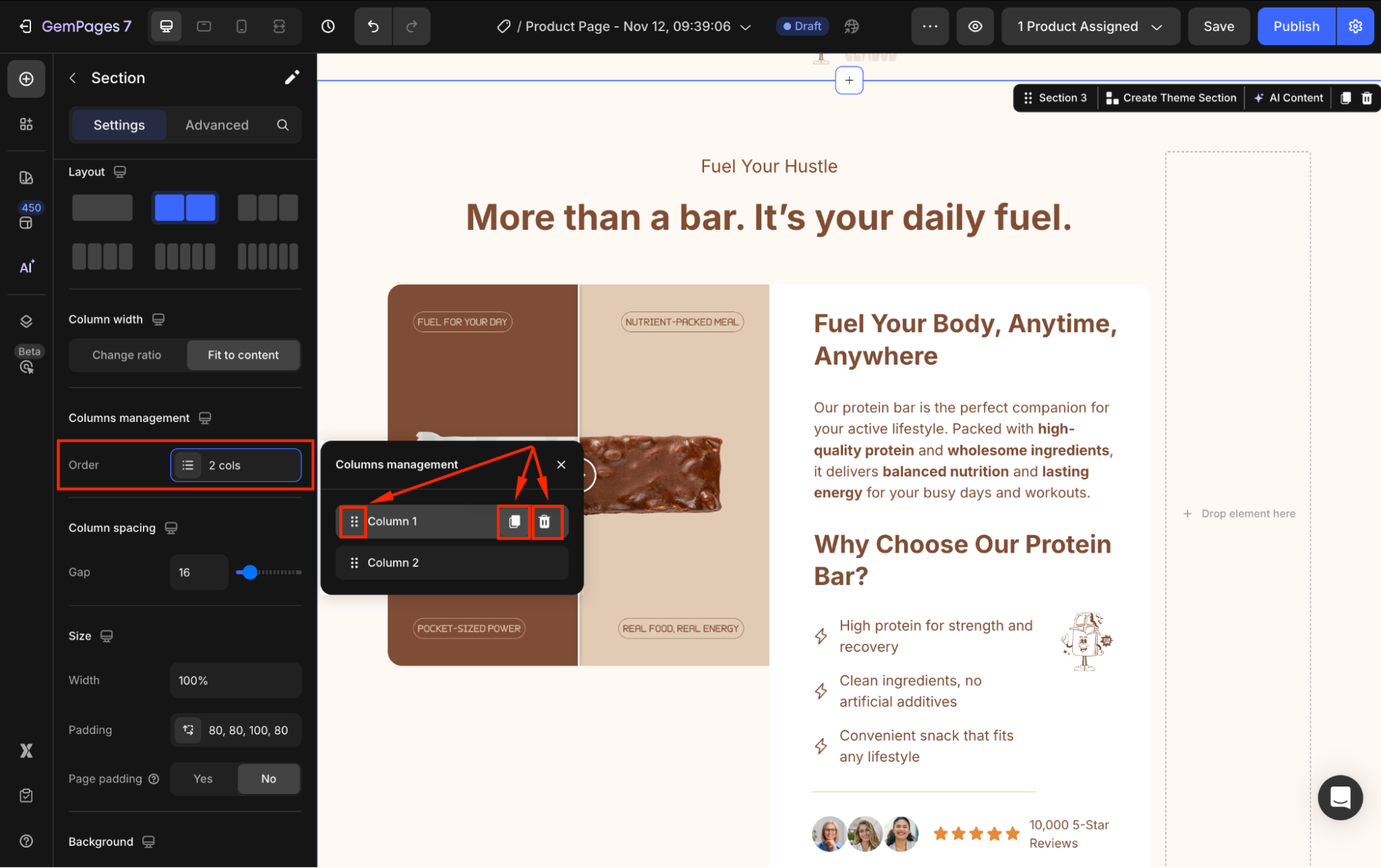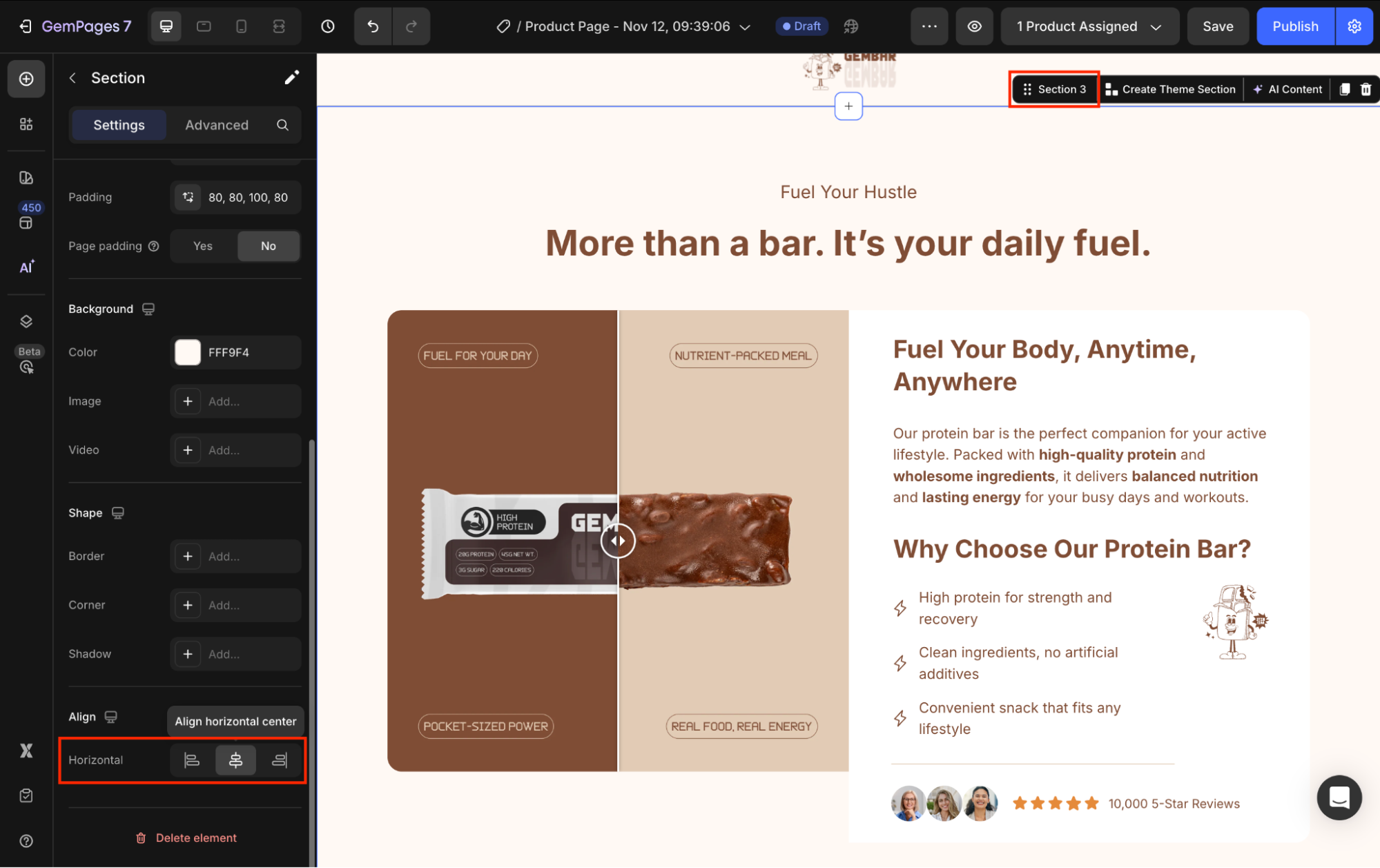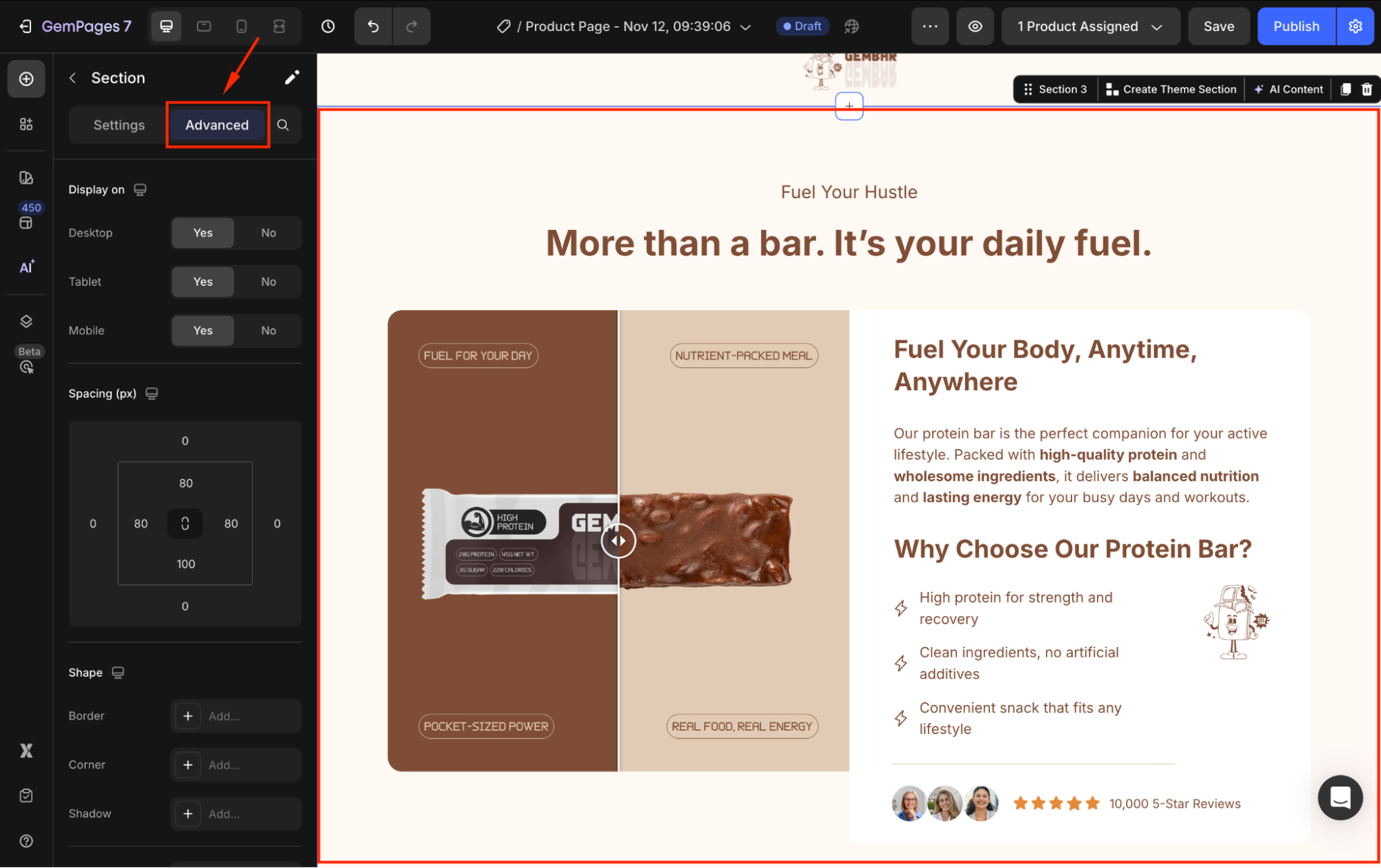 In the GemPages Editor, click on the target section to open its settings panel on your left side.