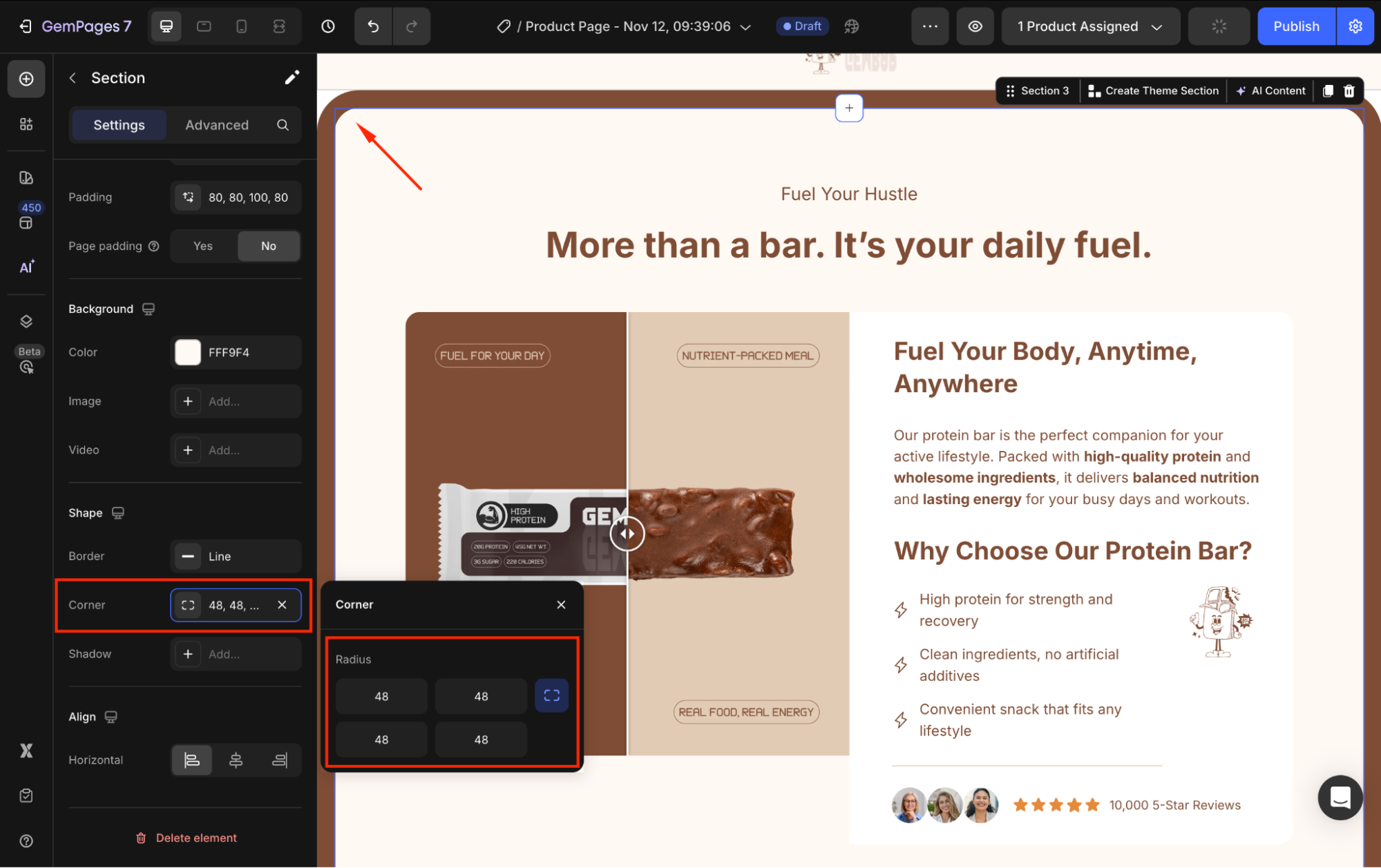 - Corner: To create a smoother visual style, adjust the corner radius of your section.