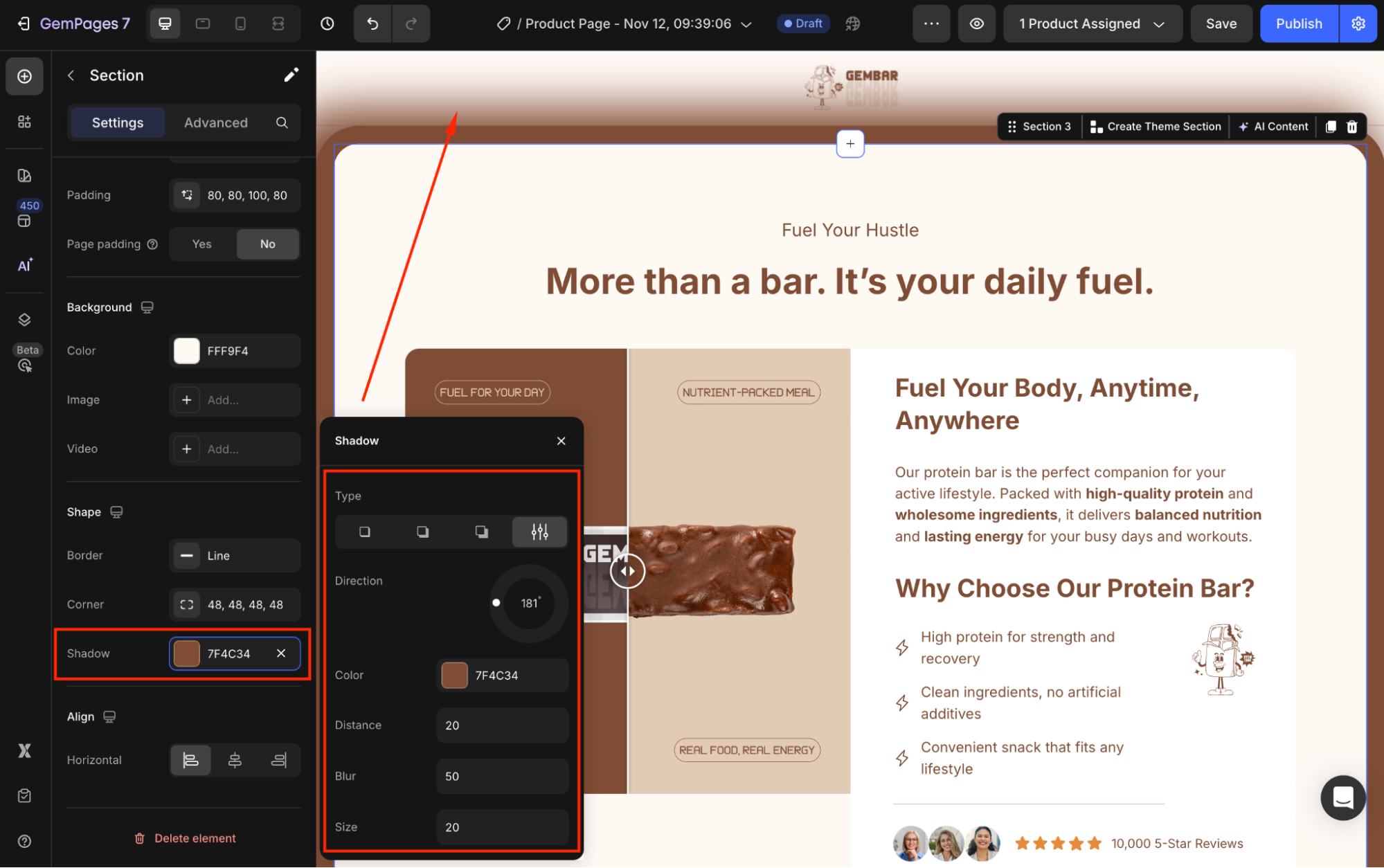 - Shadow: Use the Shadow controls to create visual depth or highlight your section. You can configure: