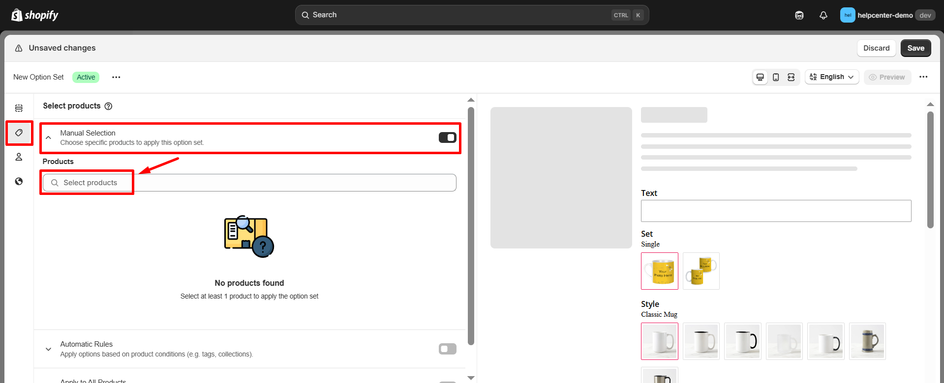 Step 5: Go to the Product tab, turn on the “Manual Selection” button and select a product you want to apply options to.