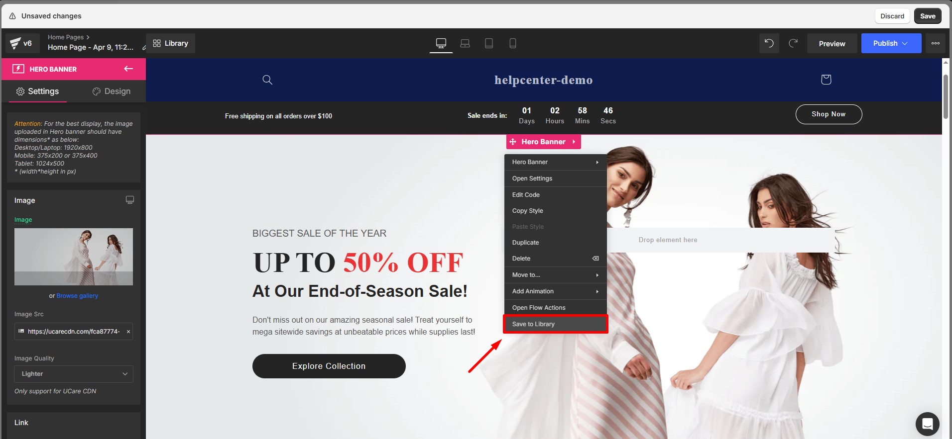 If you would like to save only a block or an element, just right-click on it and select “Save to Library”.