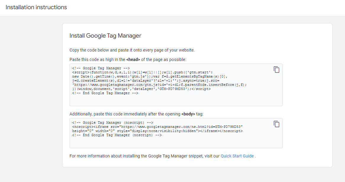 - Once that’s done, Google Tag Manager will provide you with the container snippet code that you need to insert into your pages. Copy the codes for later use.