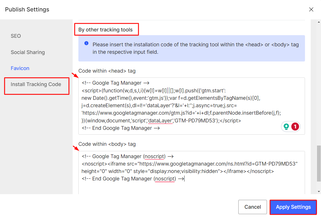 Step 4: Confirm applying the tracking code by clicking the Apply Settings button.
