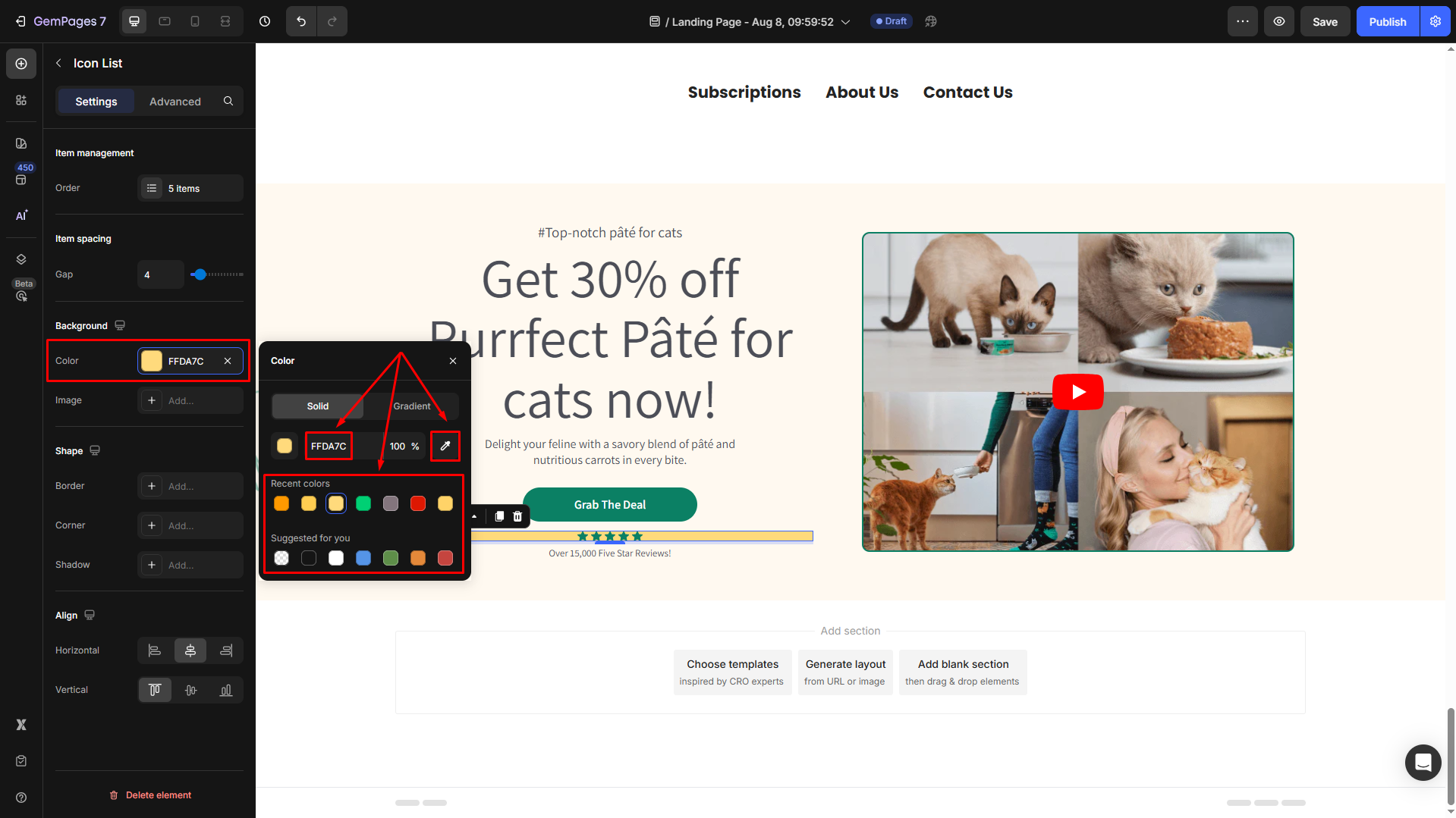 - Color: Enter the color code, choose from the “recent colors”/“suggested for you” list, or use the color picker to set the background color.