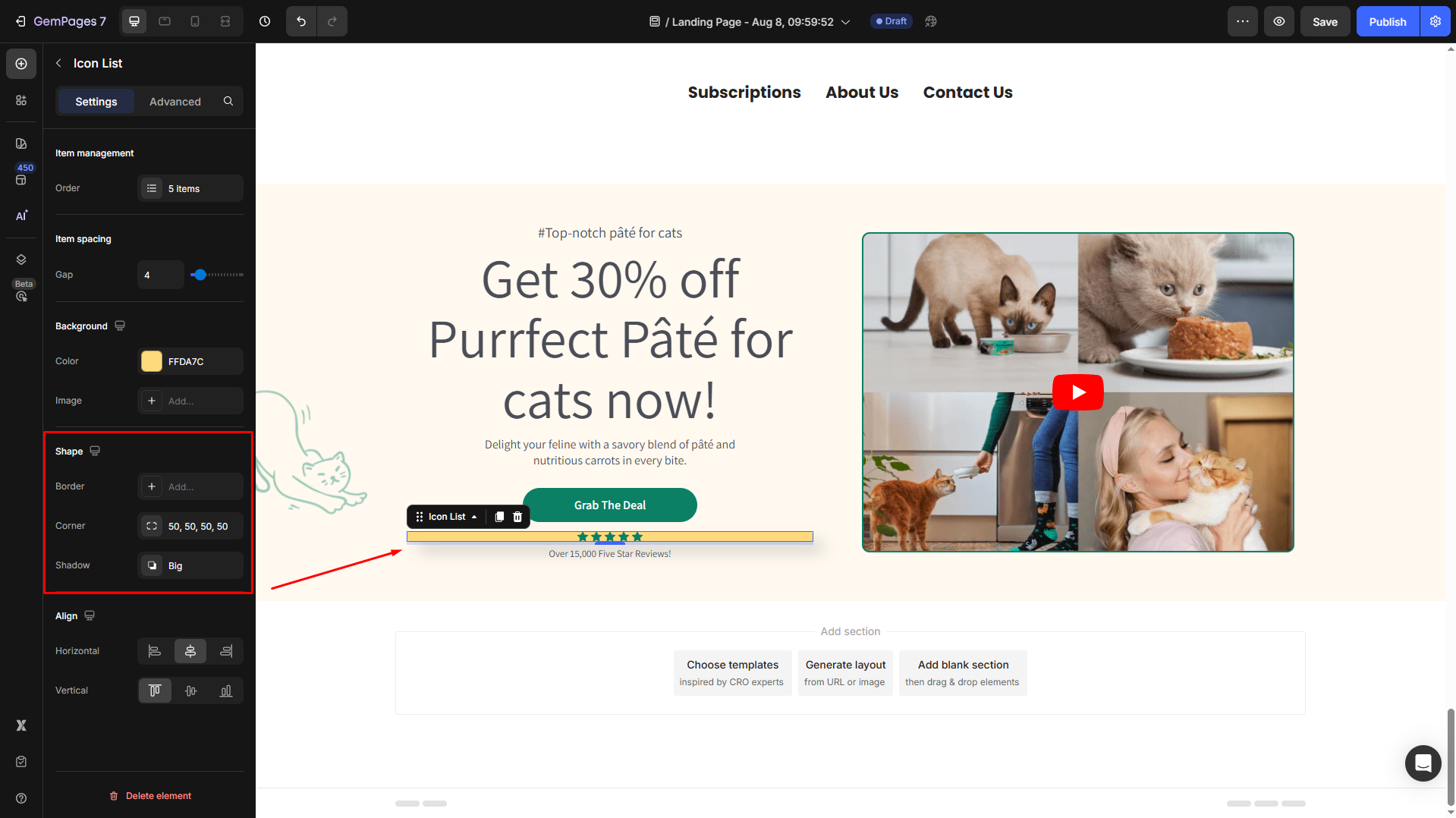 The Icon List element in GemPages displays a row of icons arranged horizontally. It’s perfect for drawing attention to specific details or features while enhancing the overall aesthetics of your store.